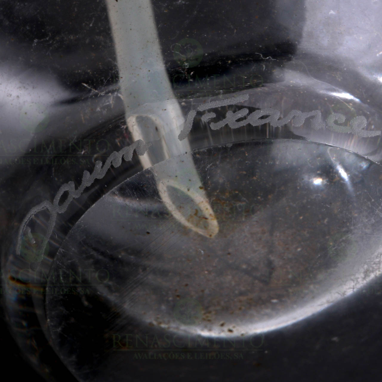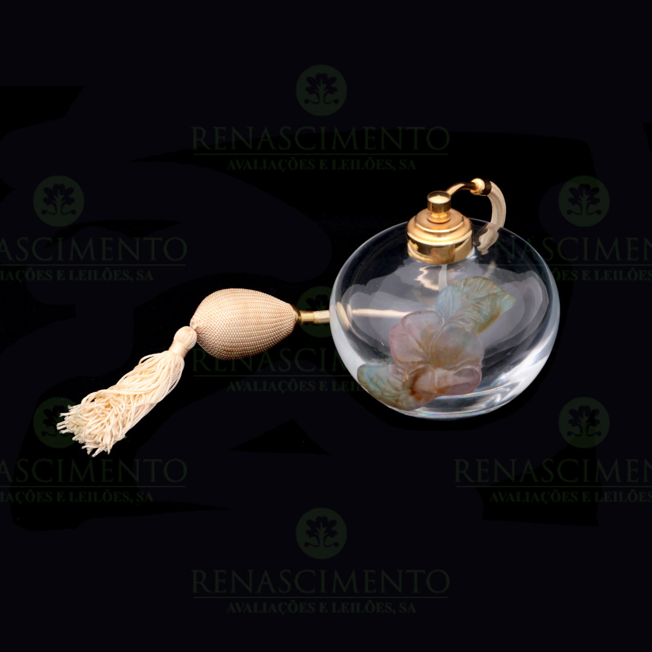 em cristal, com flor em relevo, com borrifador em metal e tecido. Marcado "Daum France". Alt.: 11,5 cm.