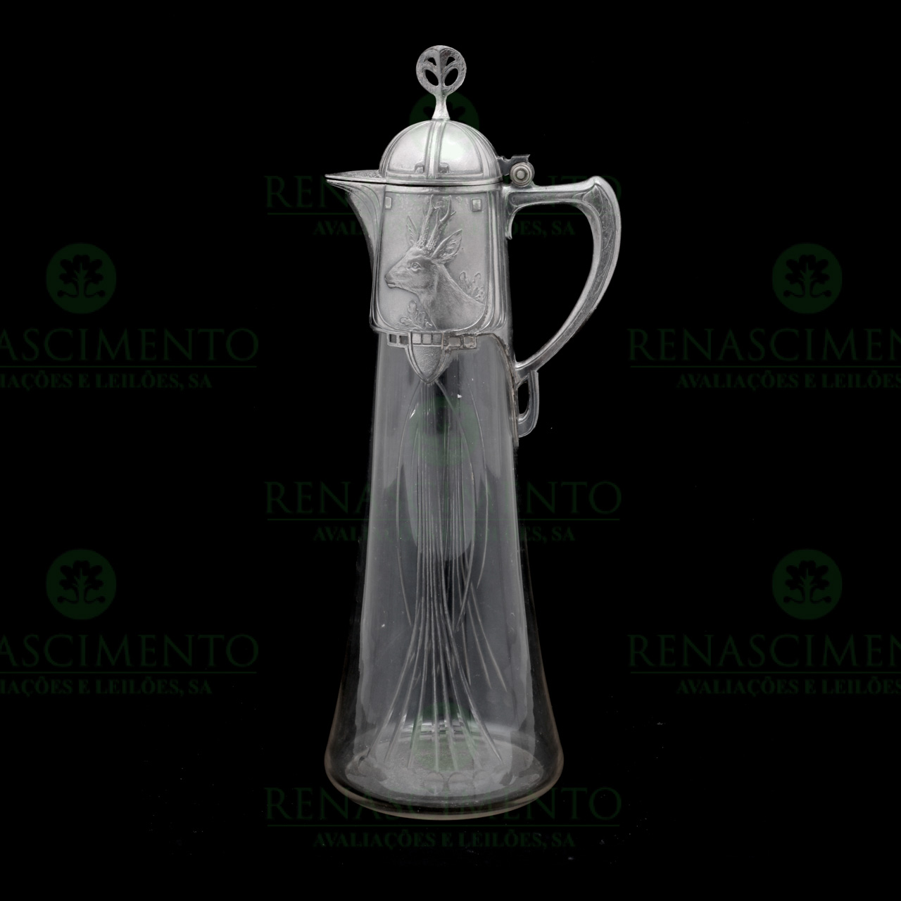em vidro lapidado e metal branco alemão WMF, decorado com caça. Cabelo. Alt. 38,5 cm.