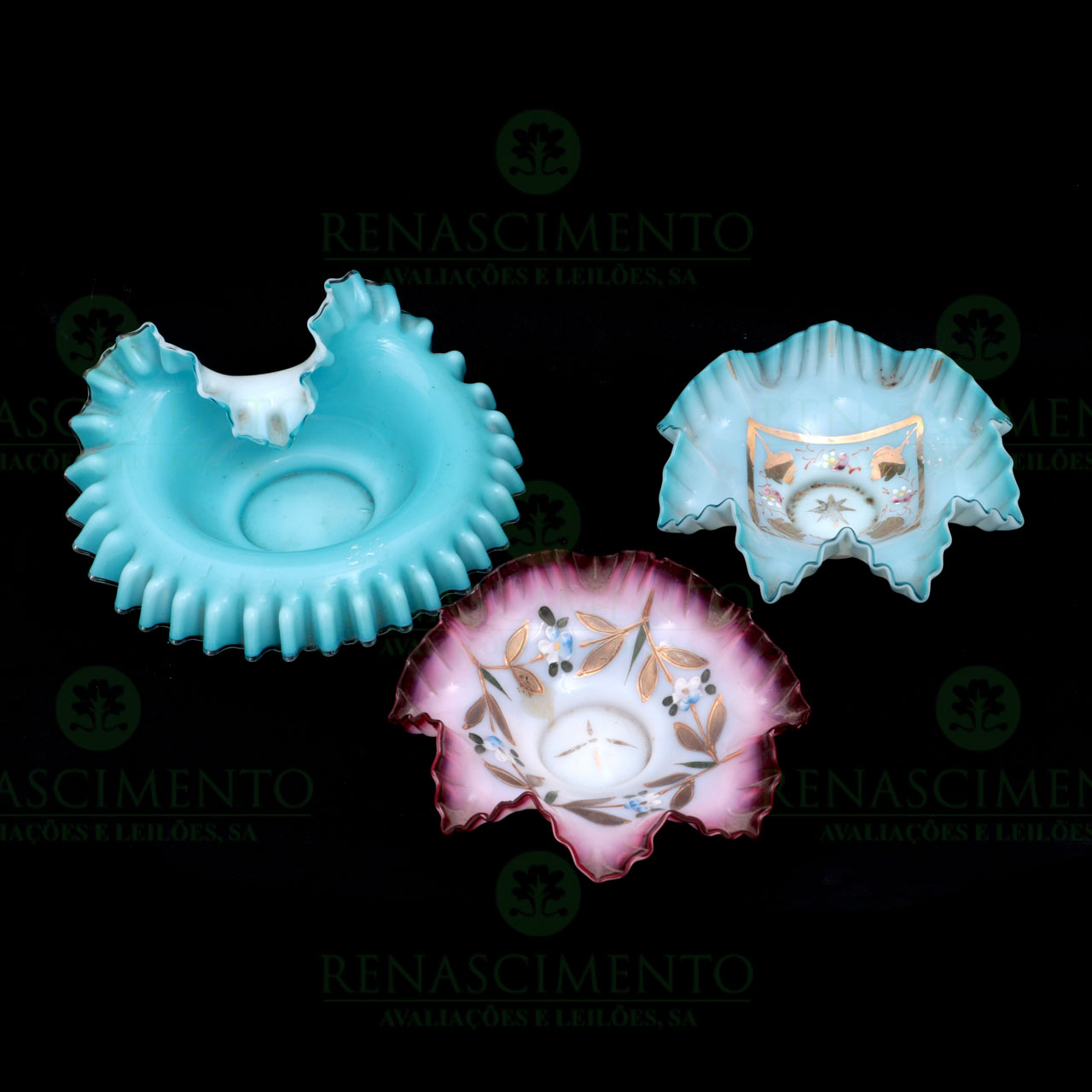 em vidro opaline azul e rosa, com ouro e esmaltes. Dim. 19x17 cm e 15,5x15,5 cm.