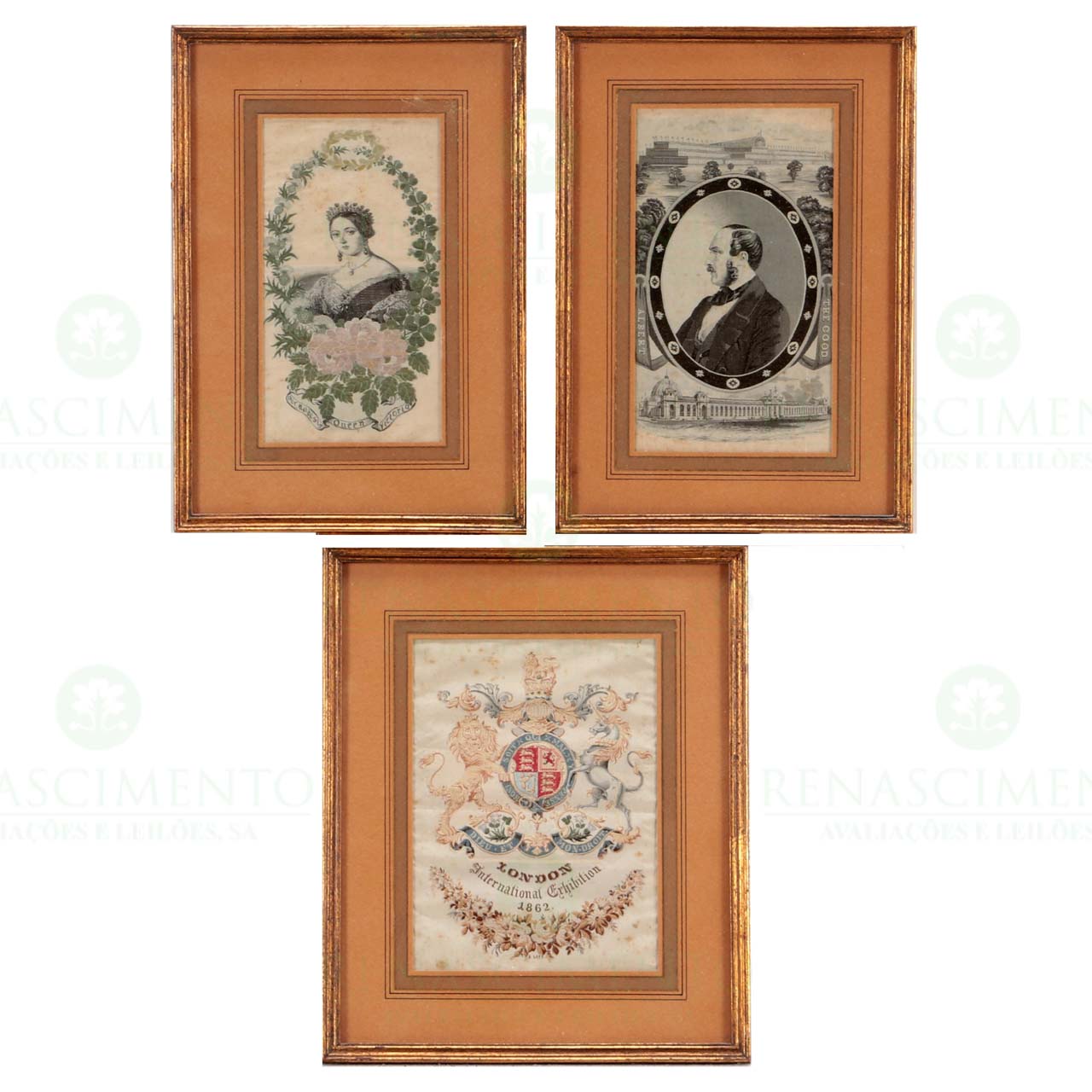 bordados sobre seda, ingleses, um datado de 1862. Picos de acidez. Dim.: entre 10x18 cm e 17x13 cm.