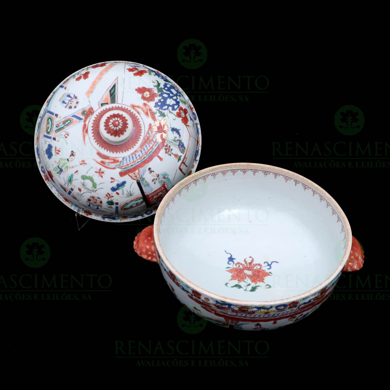 em porcelana chinesa de exportação, Dinastia Qing, transição do Reinado Yongzheng para Qianlong, c. 1740, família Rosa, com riquissima decoração de figuras orientais, objectos preciosos e vistas lacustres, rematas com cercaduras de flores. Asas a coral eouro. Dim.: 21,5x28,5 cm. Nota: esta decoração é conhecida como do serviço imperial de Habsburgo.