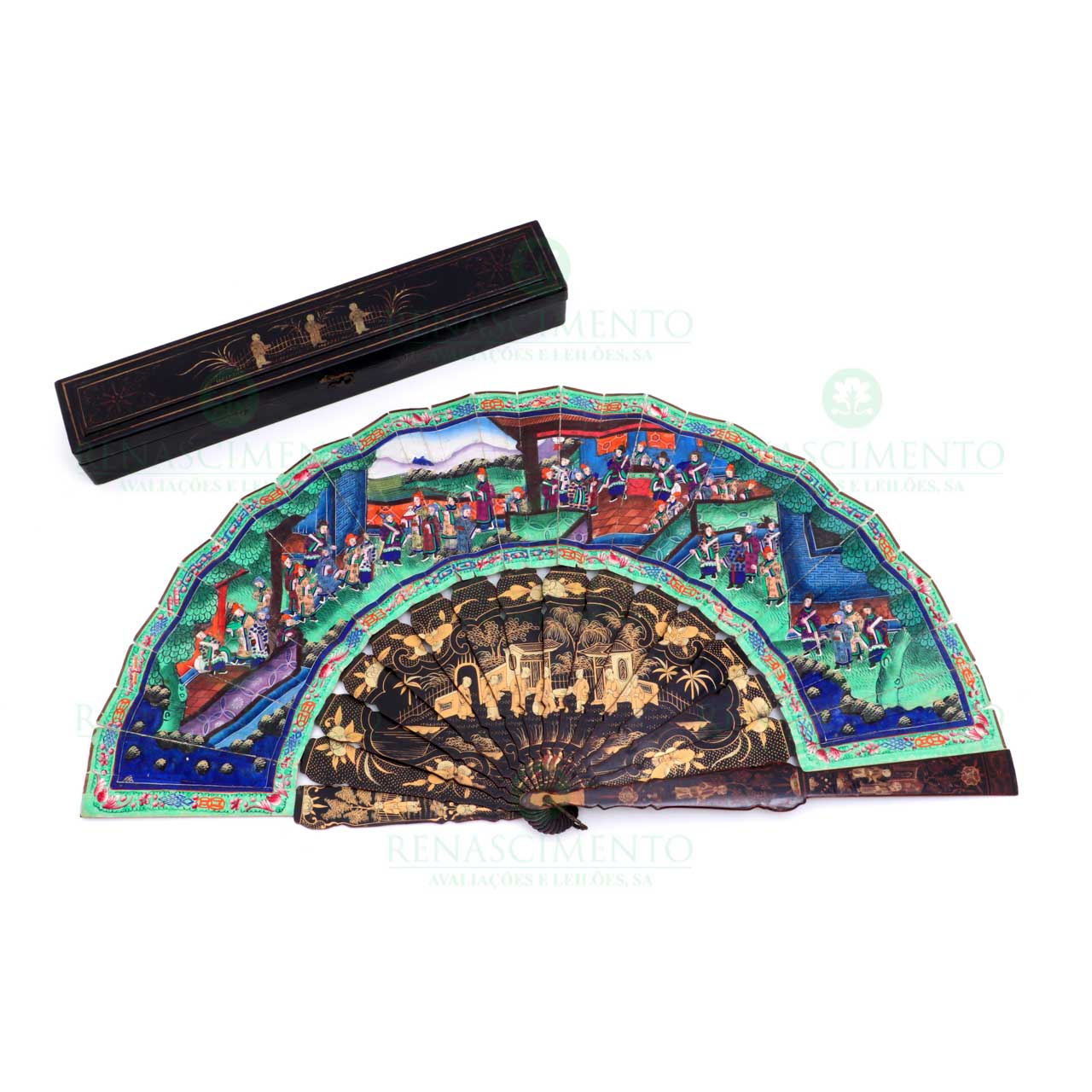 com varetas em xarão representando cenas do quotidiano chinês, a preto, ouro e coral. Folha pintada a guache de ambos os lados, representando cenas de Corte, rematada com frutos e objectos preciosos. Alguns sinais de uso. Caixa própria lacada. China,Dinastia Qing, Séc. XIX.