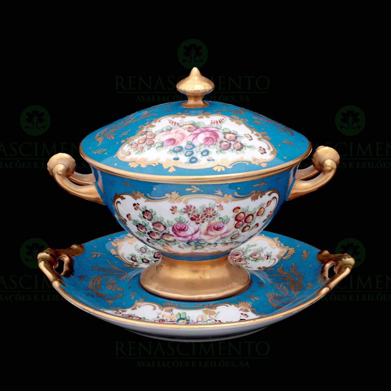 em porcelana francesa de Limoges, decoração a azul e ouro com cartelas policromadas com flores. Marcada. Pequenos desgastes. Diam. compoteira: 14,5 cm.