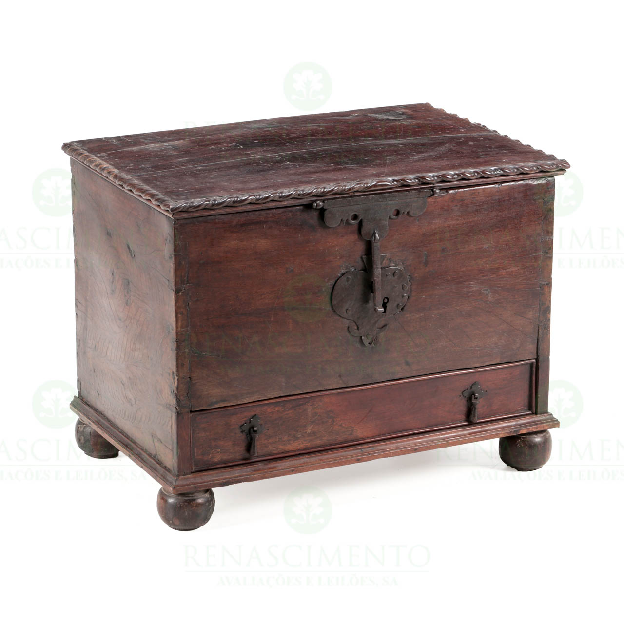 em sicupira, com uma gaveta na base. Interior forrado a chita de Alcobaça. Ferragens em ferro. Portugal, Séc. XVII/XVIII. Dim.: 57,5x74x50 cm.