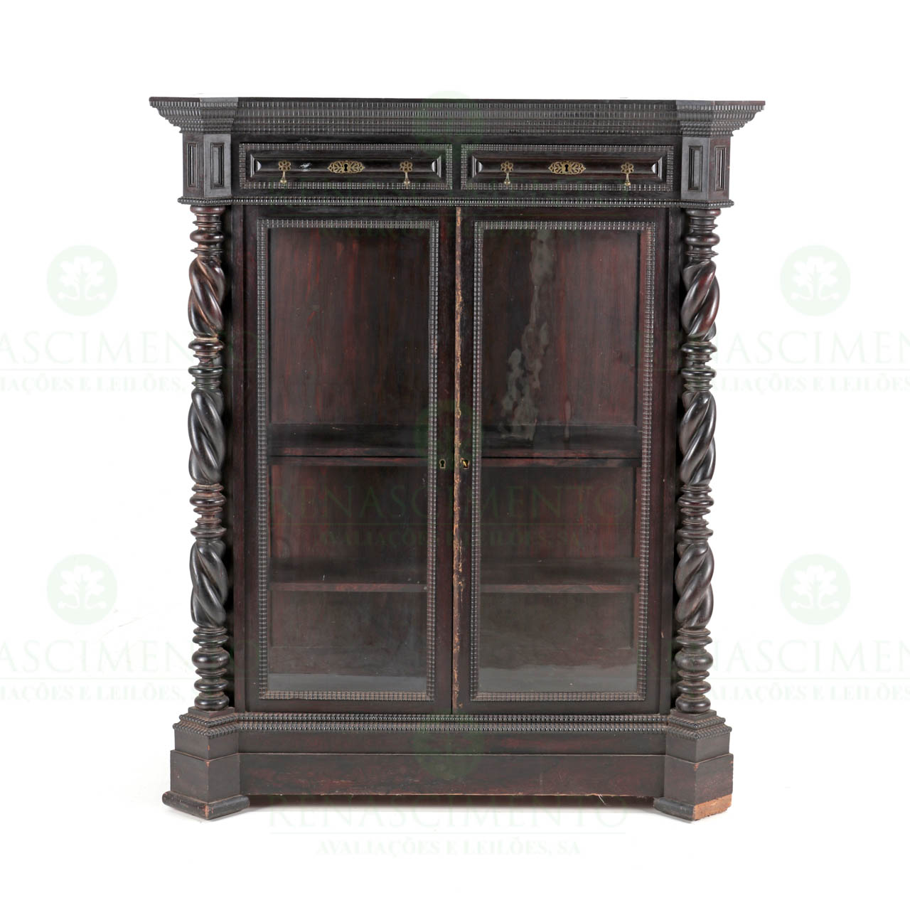 em pau-santo, com guarnições de tremidos e colunas espiraladas, duas gavetas e ferragens em latão. Portugal, Séc. XIX. Faltas e defeitos. Dim.: 136x113,5x40,5 cm.