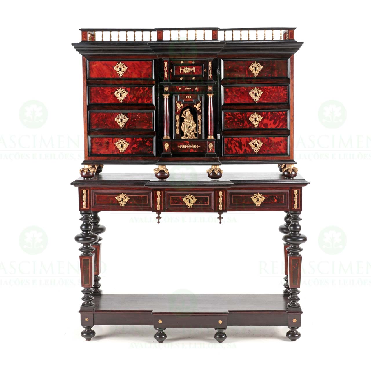em pau-santo, raiz de nogueira e pau-cetim, de frente ressaltada, com oito gavetas e porta central. Frentes imitando tartaruga e madeira ebanizada, colunas laterais na porta. Interior com cinco gavetas simulando dez e segredo. Ferragens e aplicaçõesem bronze dourado. Cimalha de balaustrada. Dim.: 169x126x45 cm.