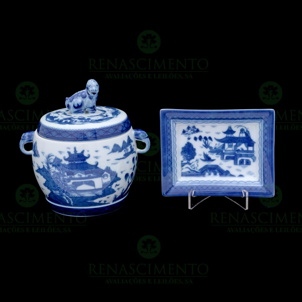 em porcelana da Vista Alegre, encomenda Mottahedeh, decoração Cantão. Alt. caixa.: 17 cm. Comp. covilhete: 14 cm.