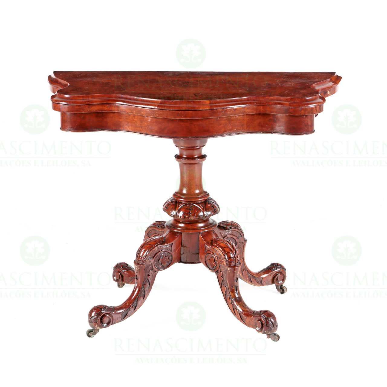 em raiz de nogueira, com pé central com entalhes. Interior forrado a feltro verde. Pés de rodízios. Inglaterra, Séc. XIX. Dim.: 70,5x90,5x45 cm.