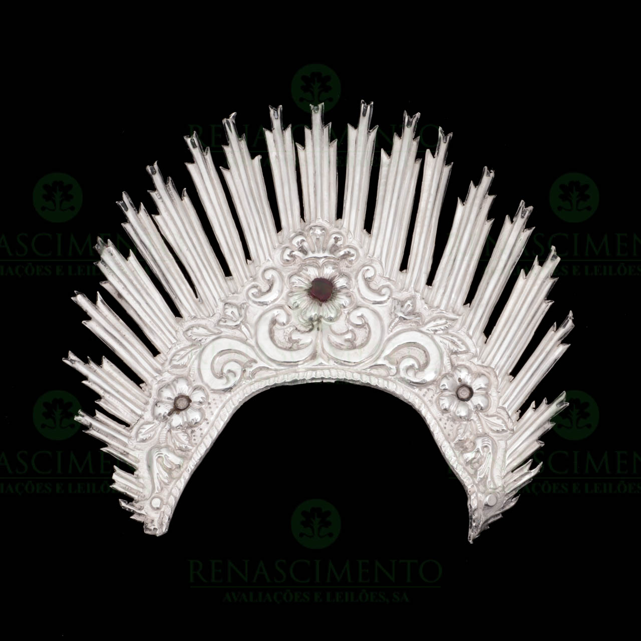 em prata, sem marcas, ao abrigo do decreto-lei nº 120/2017 de 15 de Setembro de 2017, relevado com volutas e flores, tendo no centro uma pedra encarnada. Portugal, atribuível ao Séc. XIX. Sinais de uso. Dim.: 15x17 cm. Peso: 66,3 g.