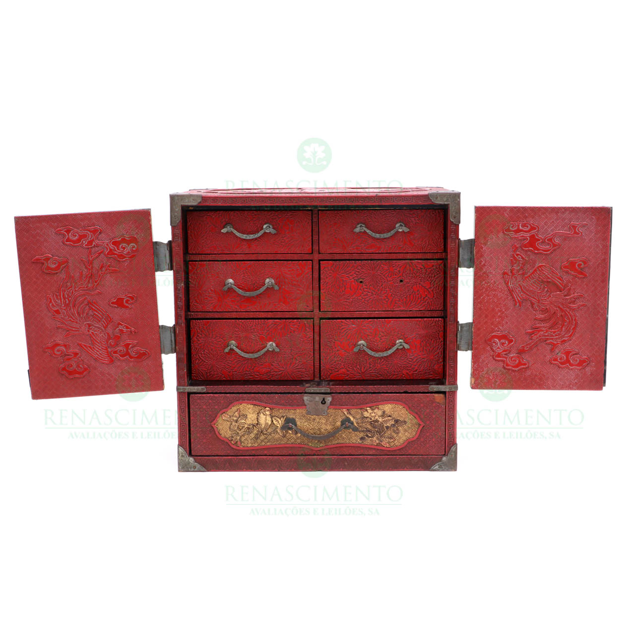 em laca de cinnabar minuciosamente esculpida representando pássaros e flores, sobre fundo de padrão geométrico. Duas portas com placas de cerâmica de Satsuma. Interior com seis gavetas. Gaveta na base. Japão, período Meiji (1868-1912). Faltas e defeitos.Dim.: 30x30,5x17,5 cm.
