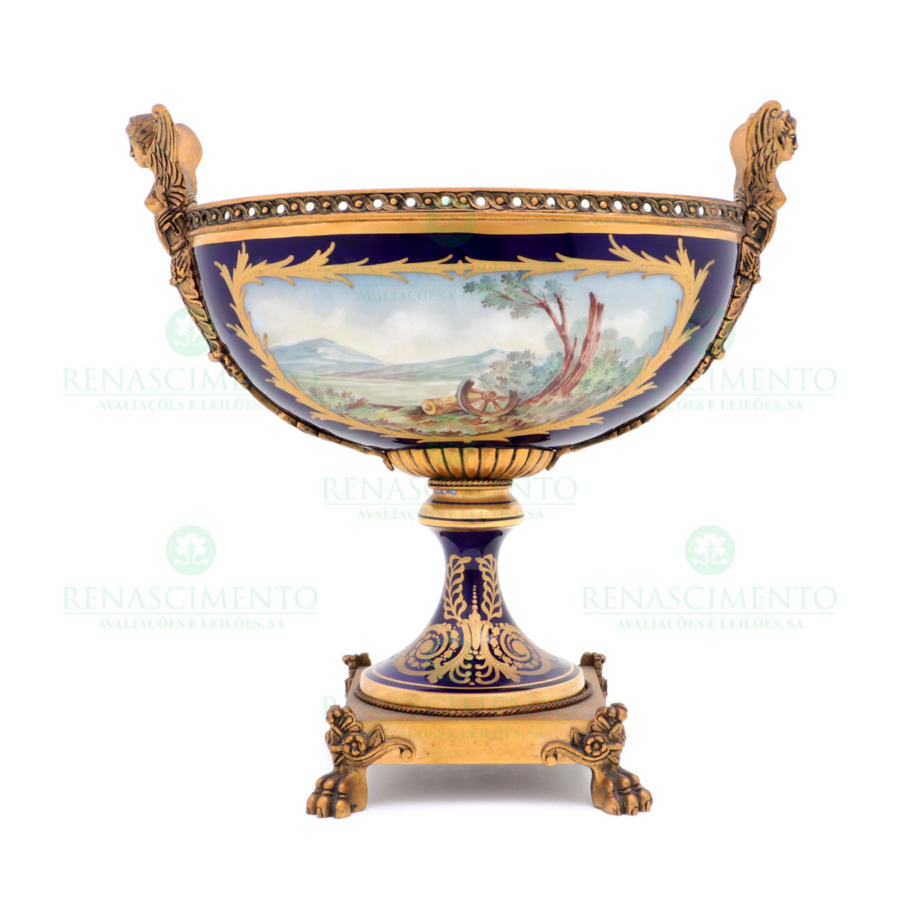 em porcelana ao gosto de Sèvres, decoração com cena de batalha e ouro, com montures em bronze dourado. Dim.: 31x30 cm.
