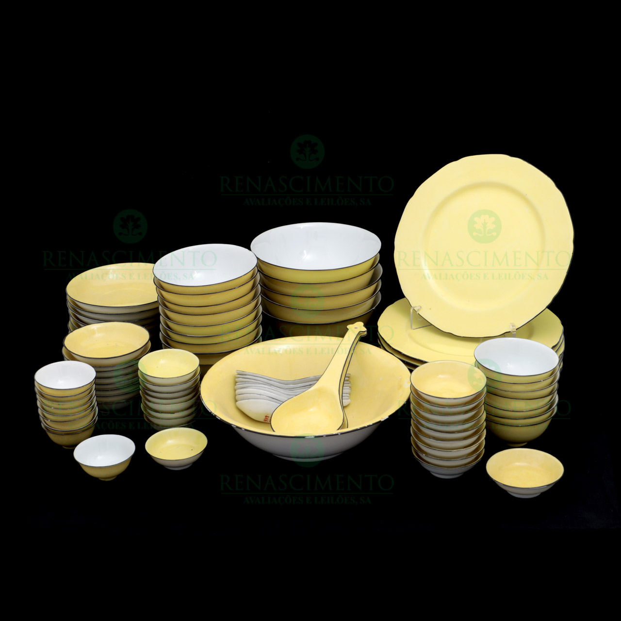 em porcelana chinesa, período Minguo, decoração monocromo amarelo. Marcado. Composto por: nove tacinhas com pires miniatura (diam.: c. 6,7 cm e c. 7 cm); 10 pires miniatura (diam.: c. 8,3 cm); sete taças e oito pires (diam.: c. 9,3 cm e c. 10,1 cm);sete covilhetes (diam.: c. 14,6 cm); nove taças (diam.: c. 12,4 cm); oito pratos recortados (diam.: 22,5 cm); cinco taças (diam.: c. 16 cm, uma com esbeiçadela e outra com grande cabelo); taça (diam.: 23,5 cm); nove colheres para arroz (comp.: c. 13,5 cm); e duas colheres de servir (comp.: c. 22 cm). Sinais de uso e algumas peças com ínfimas esbeiçadelas.