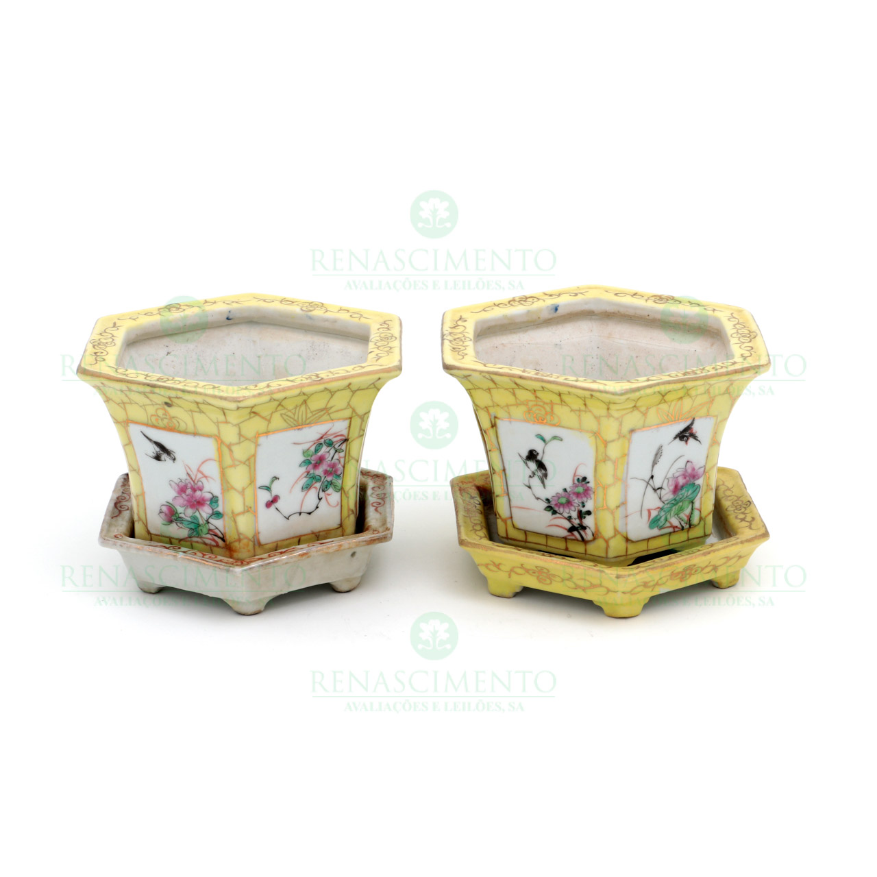 de formato sextavado, em porcelana chinesa, Dinastia Qing, decoração a azul e ouro, com reservas representando motivos florais e pássaros. Uma base muito defeituosa. Diam.: 12 cm.