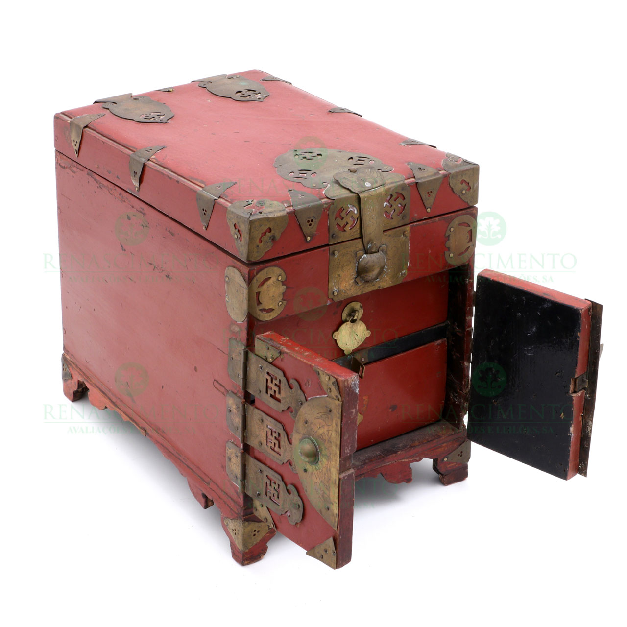 em madeira lacada a vermelho, ferragens em metal amarelo com decoração incisa e vazada com suásticas. Tampa de levantar com compartimento e portas frontais, e interior com duas gavetas. China, Dinastia Qing. Faltas e defeitos. Dim.: 29x32,5x21,5 cm.