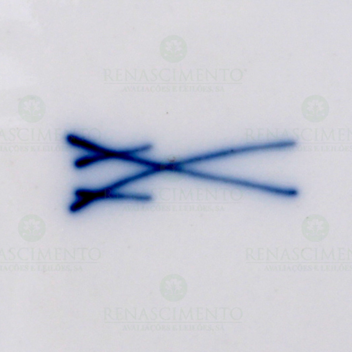em porcelana de Meissen, sendo o centro policromado com arranjo floral e a orla relevada a ouro e verde com flores. Diam.: 31 cm.