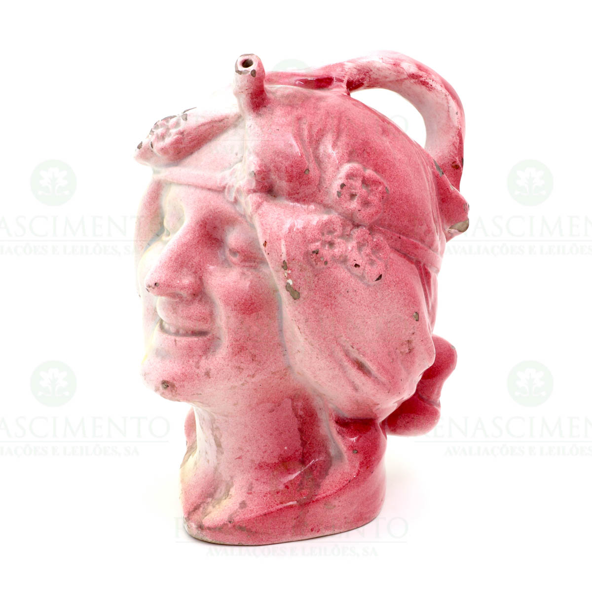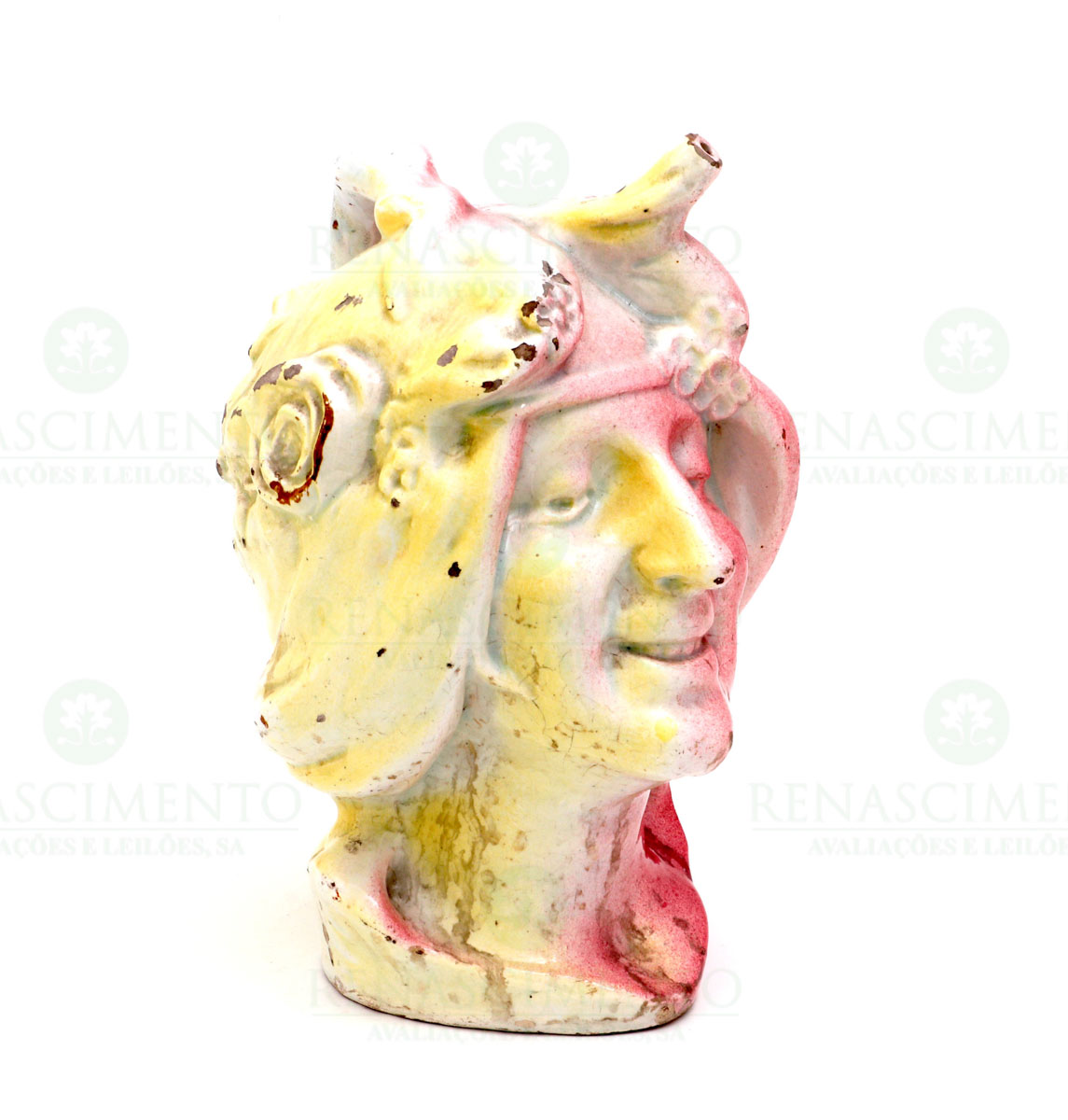 em cerâmica europeia, possivelmente francesa, vidrada em tons rosa e amarelo. Datada na base de 1917. Ínfimas faltas nos esmaltes. Alt.: 26 cm.