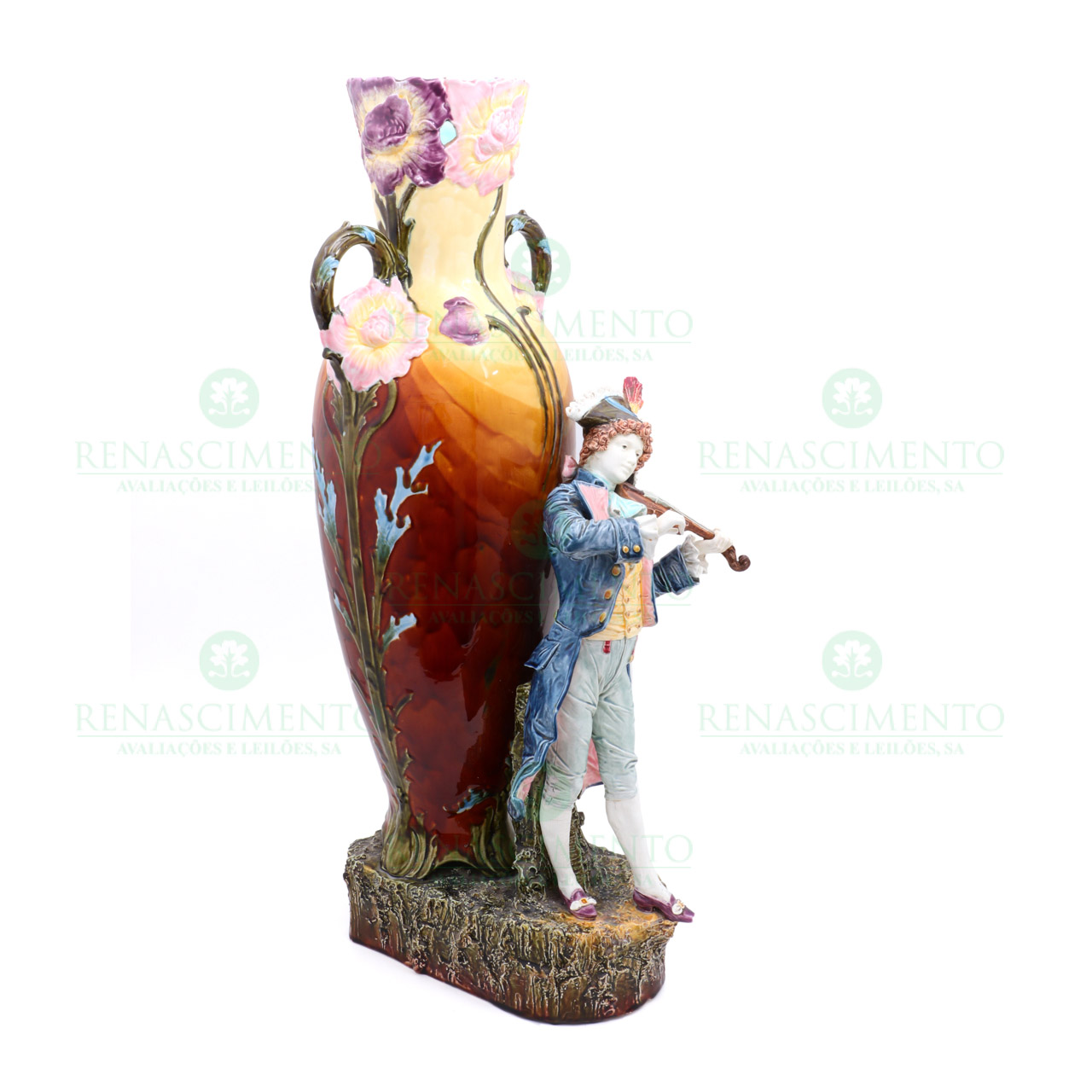 em cerâmica italiana, Séc. XIX/XX, decoração policromada e relevada com motivos florais, com veneziano tocando violino. Dim.: 73,5x30x36,5 cm.