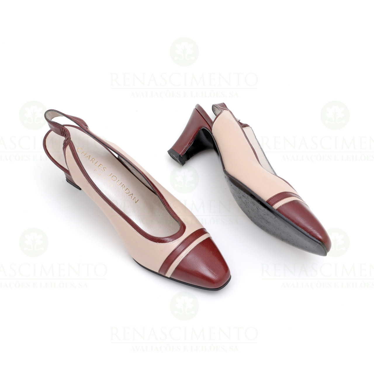 em pele bege e castanha, abertos no calcanhar. Tamanho 37. Sinais de uso, mas em bom estado.