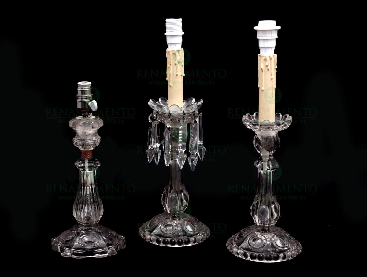 em vidro tipo Baccarat. Electrificados. Um com defeito. Alt. 28 cm e 38 cm.