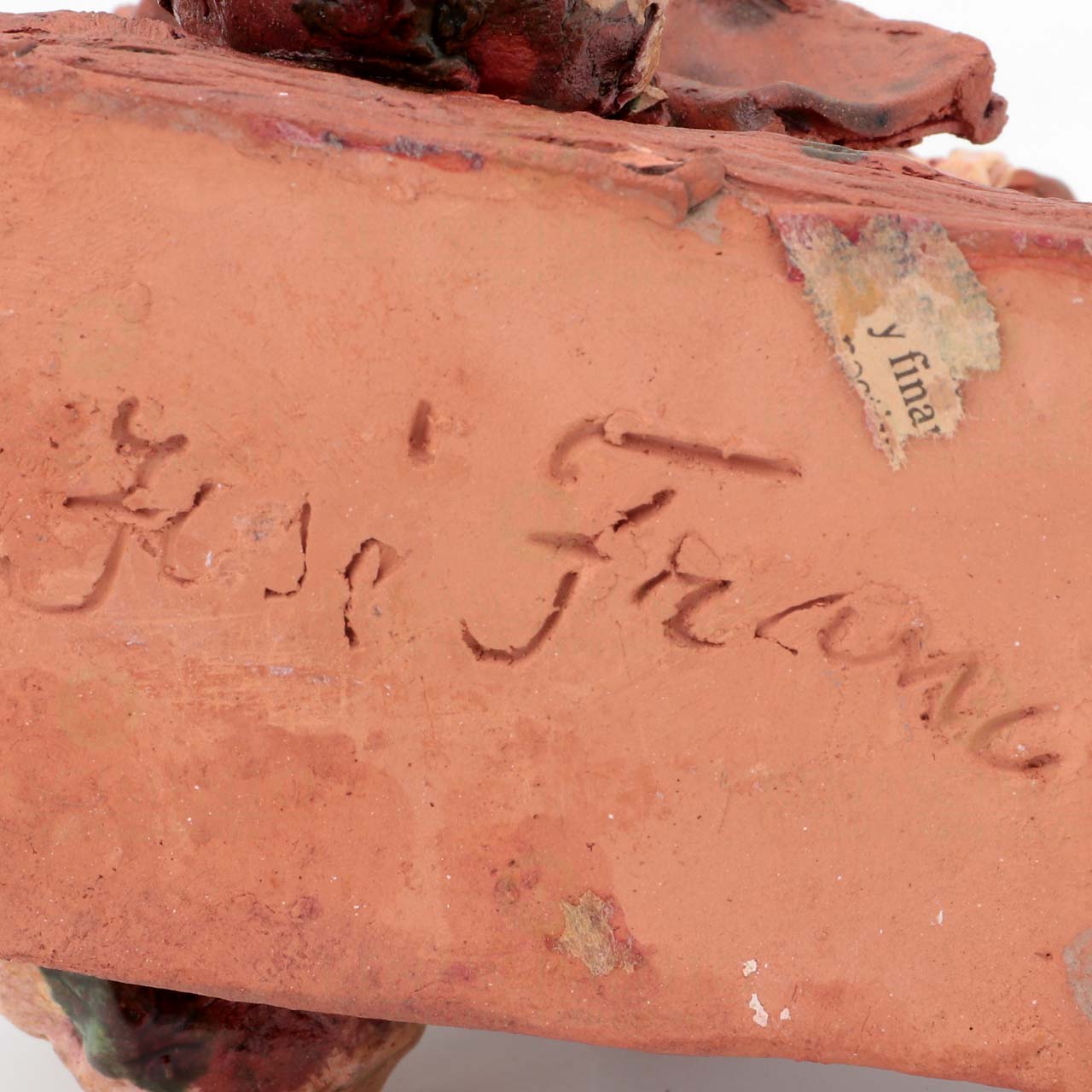 escultura em barro, parcialmente pintado. Assinado na base. Dim.: 10x11x10 cm.