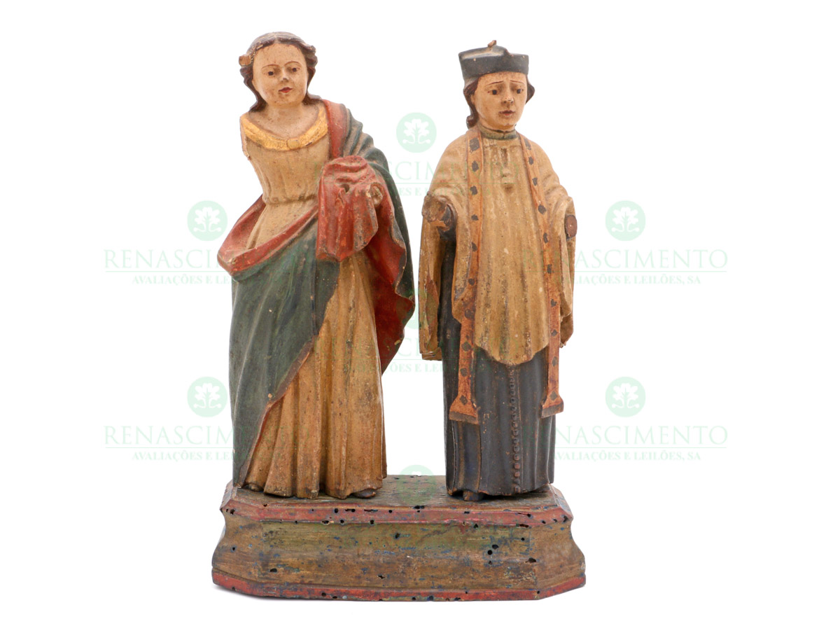 grupo escultórico em madeira policromada, assente em base pintada. Portugal, Séc. XVIII. Faltas, defeitos e vestígios de xilófagos. Dim.: 23x15x6 cm.