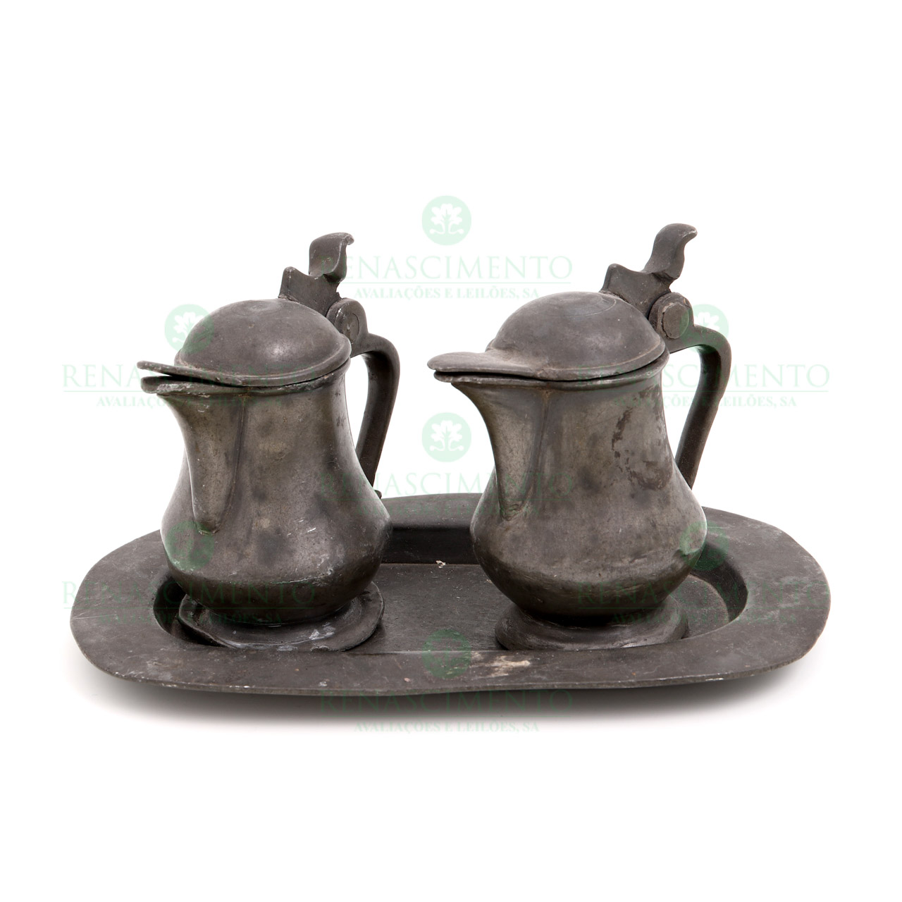 em estanho. Portugal, Séc. XVIII. Amolgadelas. Alt. galhetas: 9 cm. Comp. bandeja: 19 cm.
