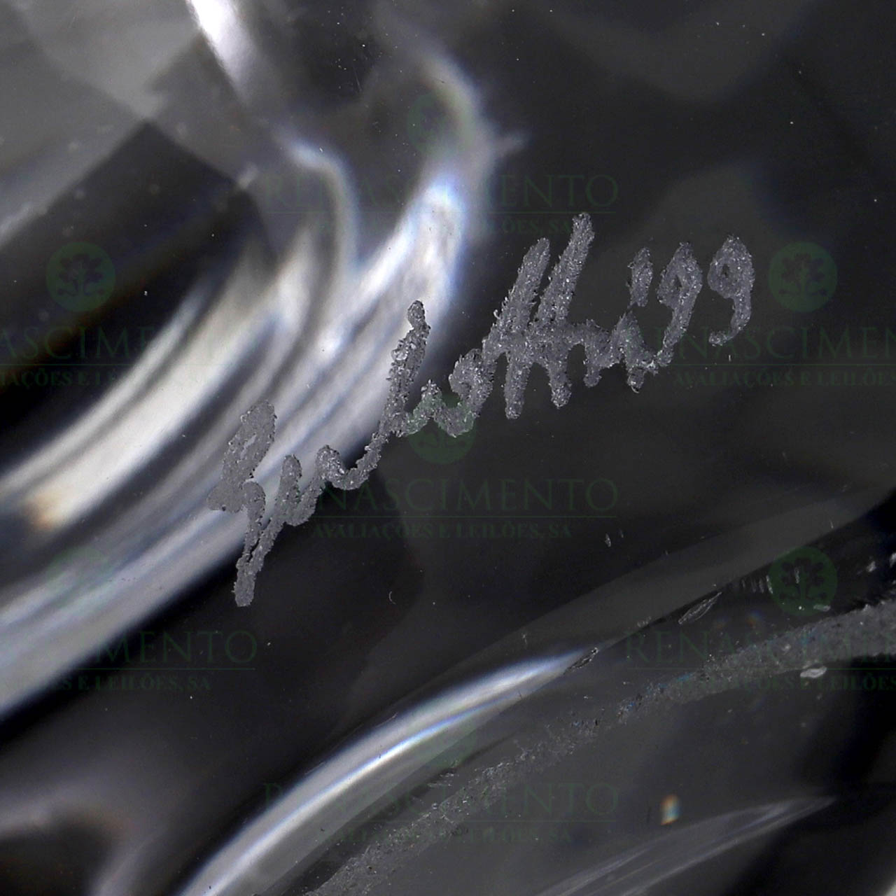 em cristal translúcido e fosco. Assinada e datada de 99. Alt.: 23 cm.
