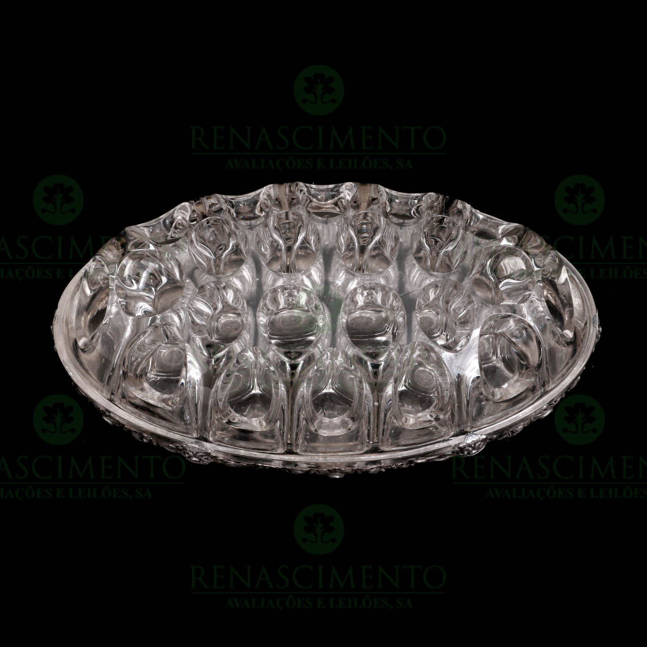 em vidro moldado, de fabrico inglês, com armação em prata, sem marcas, ao abrigo do decreto-lei nº 120/2017 de 15 de Setembro de 2017. Grande defeito no vidro. Dim.: 13x18 cm.