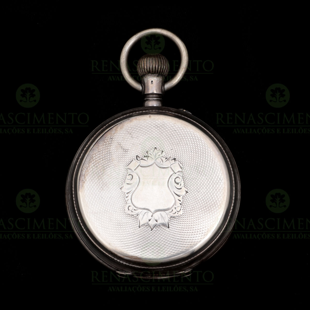 com tampas em prata de 800/000, marcas de garantia francesas. Mostrador esmaltado, policromado e marcado "João Esquetini - Beja". Tampas guilhochadas com cartela. A funcionar, necessitando limpeza. Ligeiras amolgadelas. Peso bruto: 132,5 g.