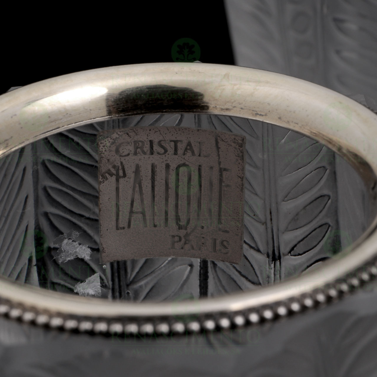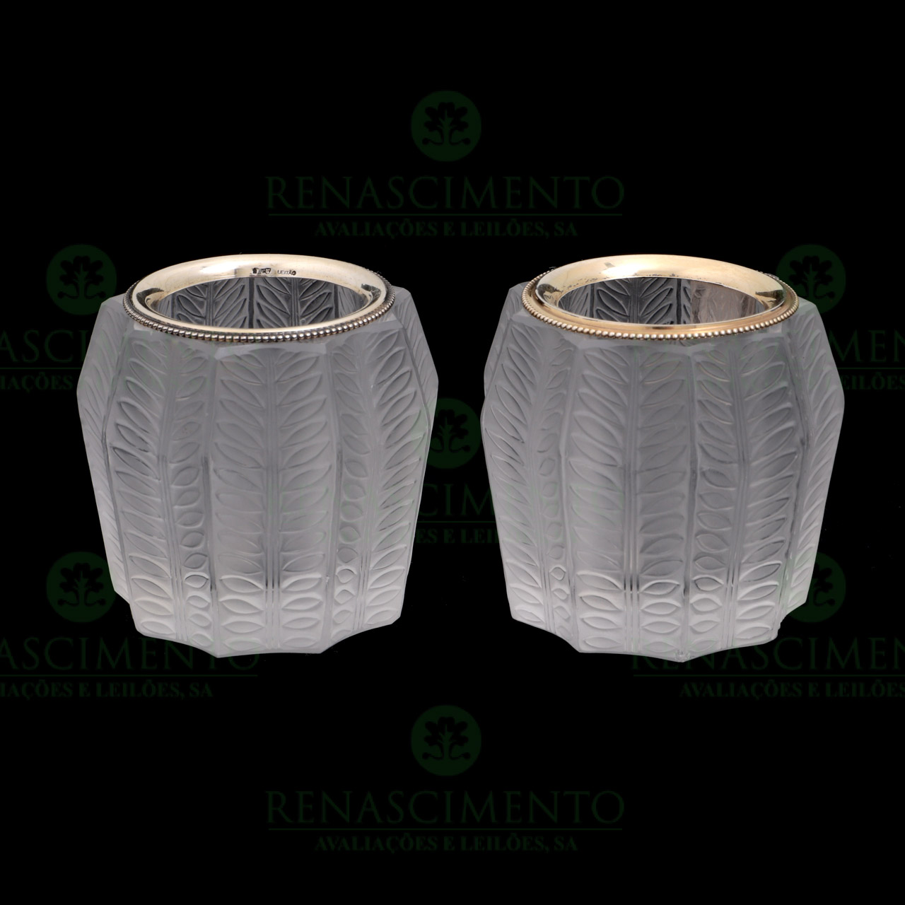 em cristal fosco, marcados Lalique France, com aros em prata de 925/1000 contraste de Lisboa (1995-2000), marca comercial Leitão & Irmão. Alt.: 6,5 cm.