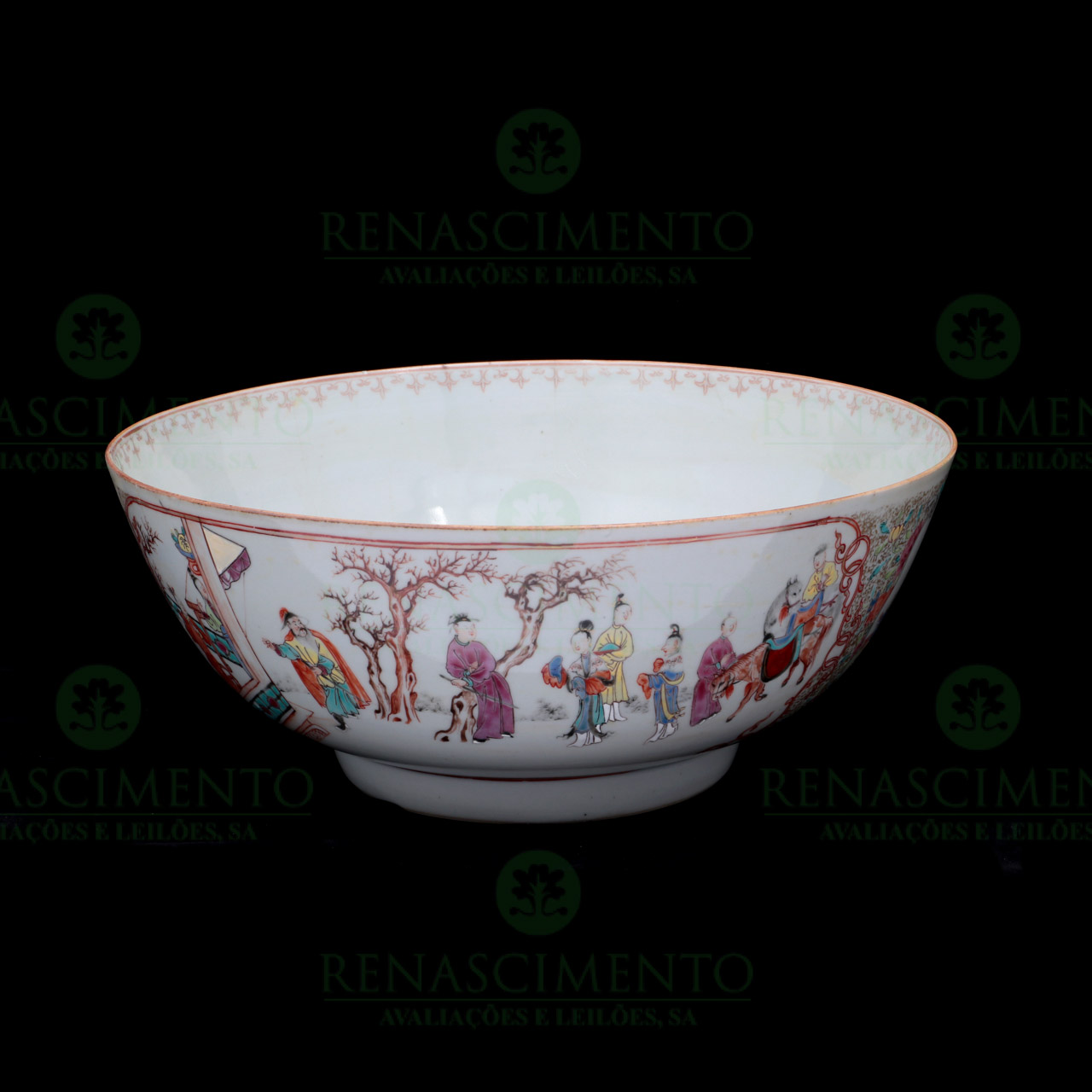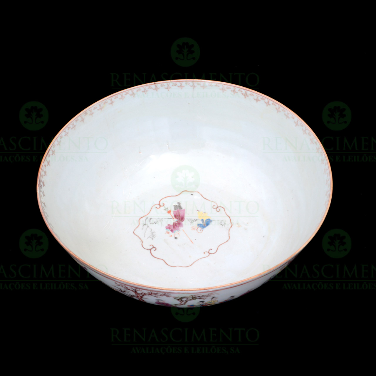 em porcelana chinesa de exportação, Dinastia Qing, Reinado Qianlong (1736-1795), família Rosa, com reservas representando cenas do quotidiano chinês. Cabelos com restauros antigos. Diâm. 31 cm.