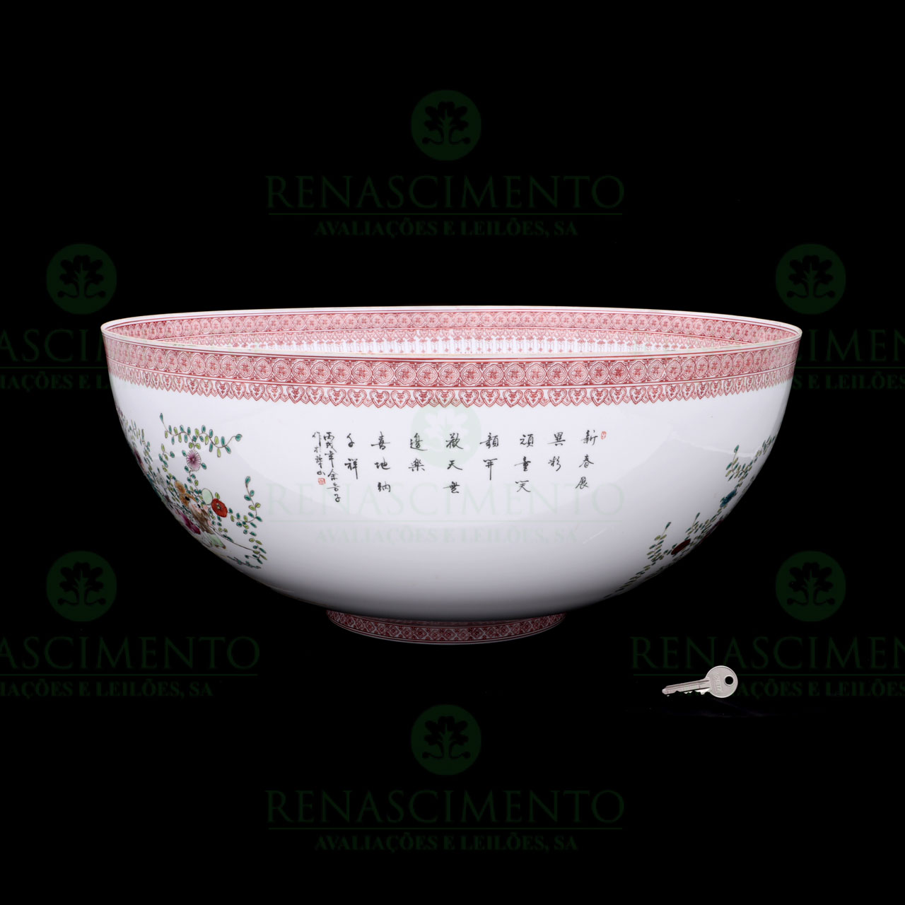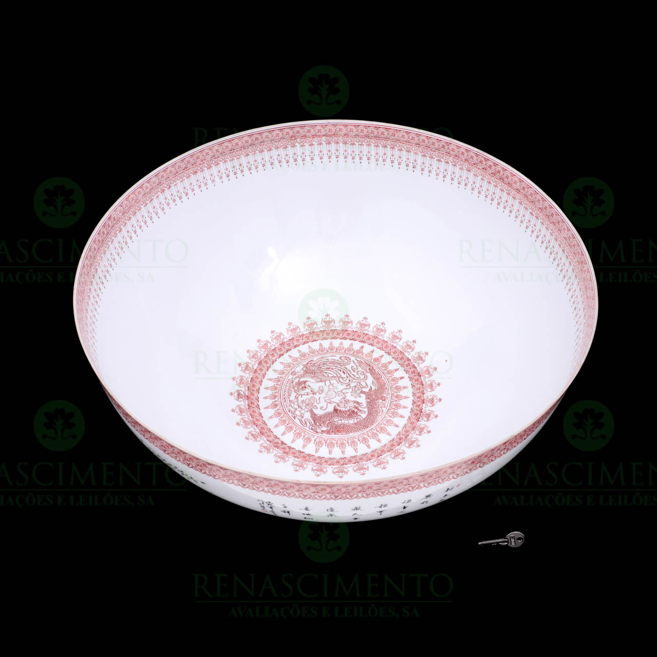 em porcelana chinesa "casca de ovo", policromada, com meninos sorridentes em jardim e caracteres. Interior encarnado com dragão e fénix ao centro. Marcada. Diam.: 59 cm.
