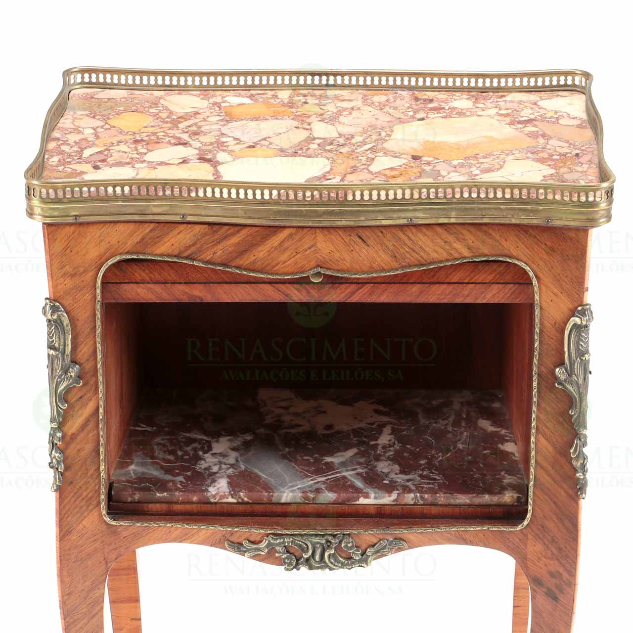 em pau-rosa, com filetes em espinheiro. Portas de esteira, com mármore no interior. Tampos de mármores com gradinha. Ferragens e aplicações em bronze dourado. Uma porta com defeito. Dim.: 72,5x44x30 cm.