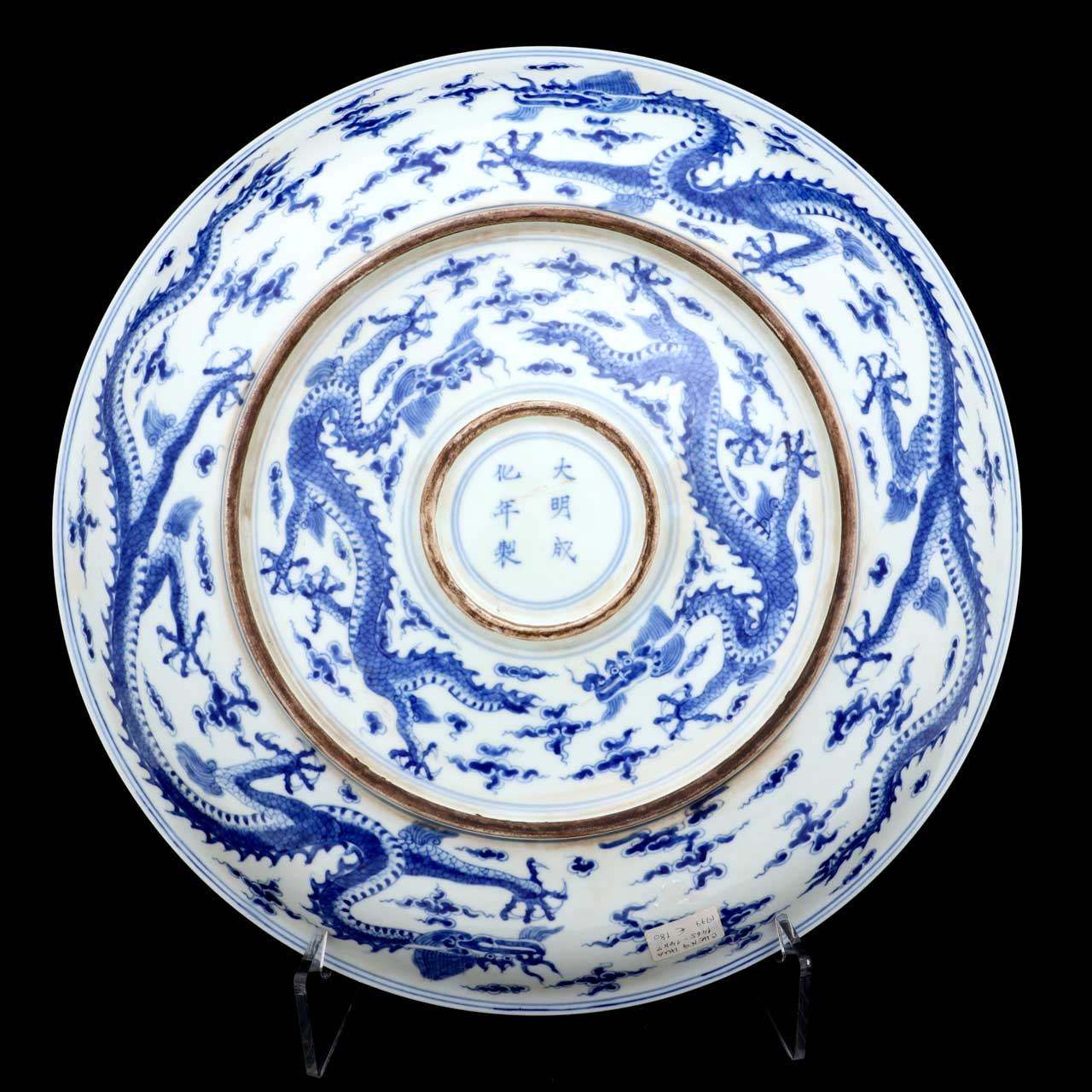 em porcelana chinesa, Dinastia Qing, decorado a azul e branco com dragões no interior e no exterior. Marcado. Pequena esbeiçadela no bordo. Diam.: 42 cm.