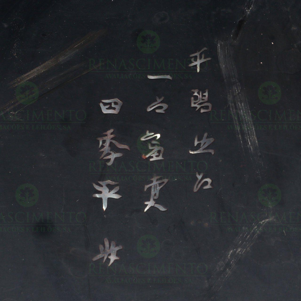 em madeira lacada, com incrustações em madrepérola. Sinais de uso. Dim.: 40,5x120x62 cm.