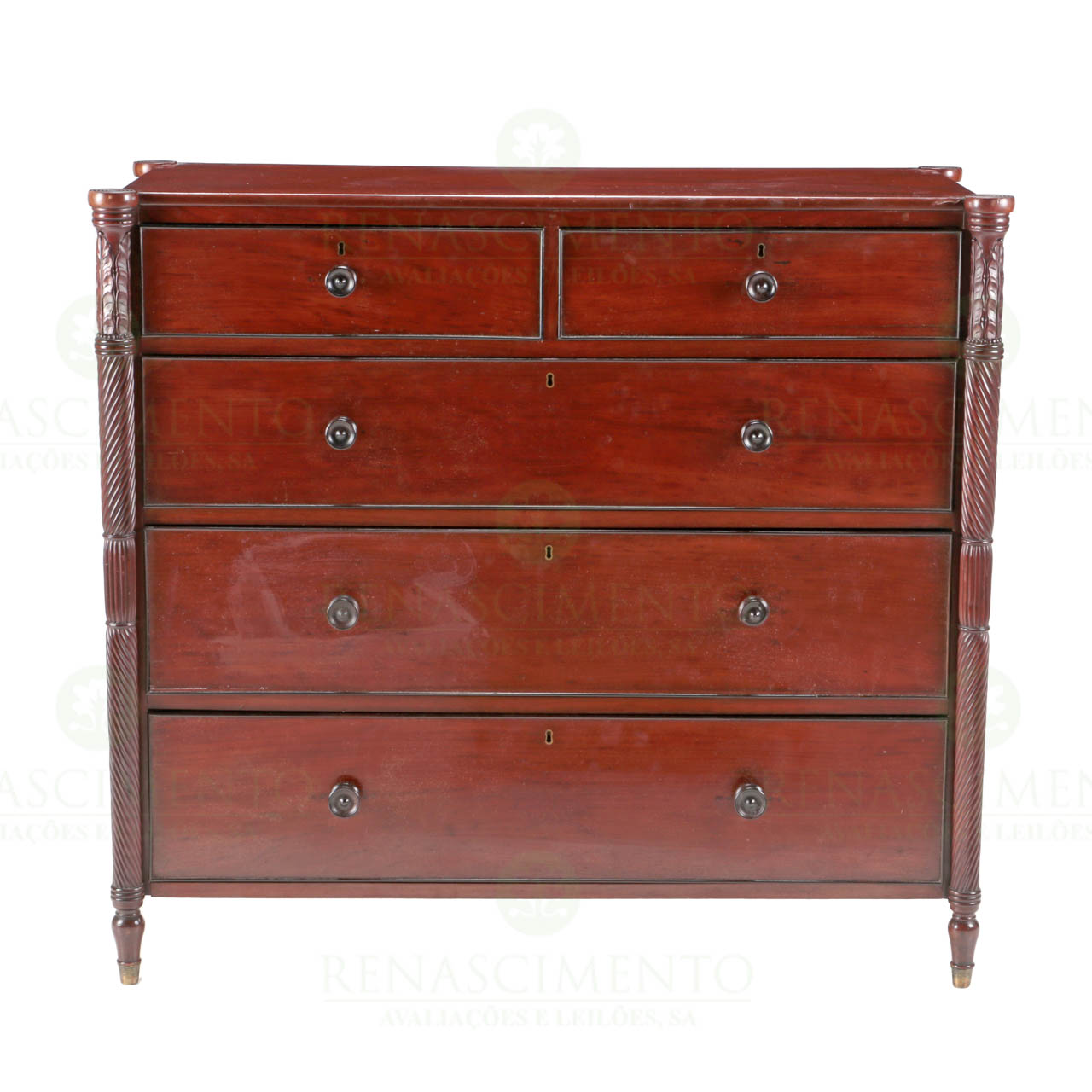 em mogno-de-cuba, com quatro colunas espiraladas e folhas de acanto. Duas gavetas e três gavetões. Açores, ilha de São Miguel, meados do Séc. XIX, atribuída à família Kines. Vestígios de xilófagos e pequenos defeitos. Dim.: 113,5x128x62 cm.Nota: a família Kines, de origem italiana e inglesa fixou-se na ilha de São Miguel na década de 1830 e durante várias gerações produziram mobiliário de grande qualidede, muito dele com influência inglesa. Esta cómoda é provavelmente uma dessas peças, tendo paralelo com peças conhecidas em colecções açorianas. Proveniência: colecção particular, ilha de São Miguel (Açores).