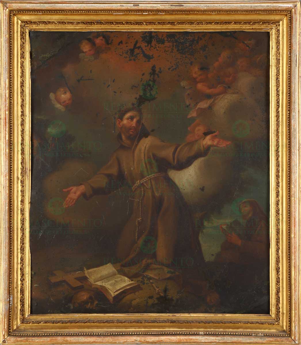 óleo sobre cobre. Faltas e defeitos. Moldura dourada. Dim.: 60x52 cm.