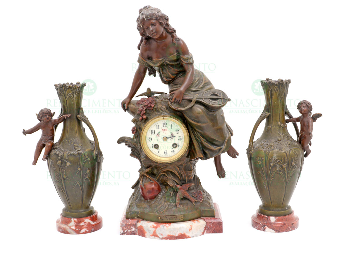 em bronze d'arte, com patines verdes e castanhas. Relógio representando figura feminina com bandolim e jarras com putti. Assentes em mármore. França, Séc. XIX. Alt. relógio: 46,5 cm. Alt. jarras: 32 cm.