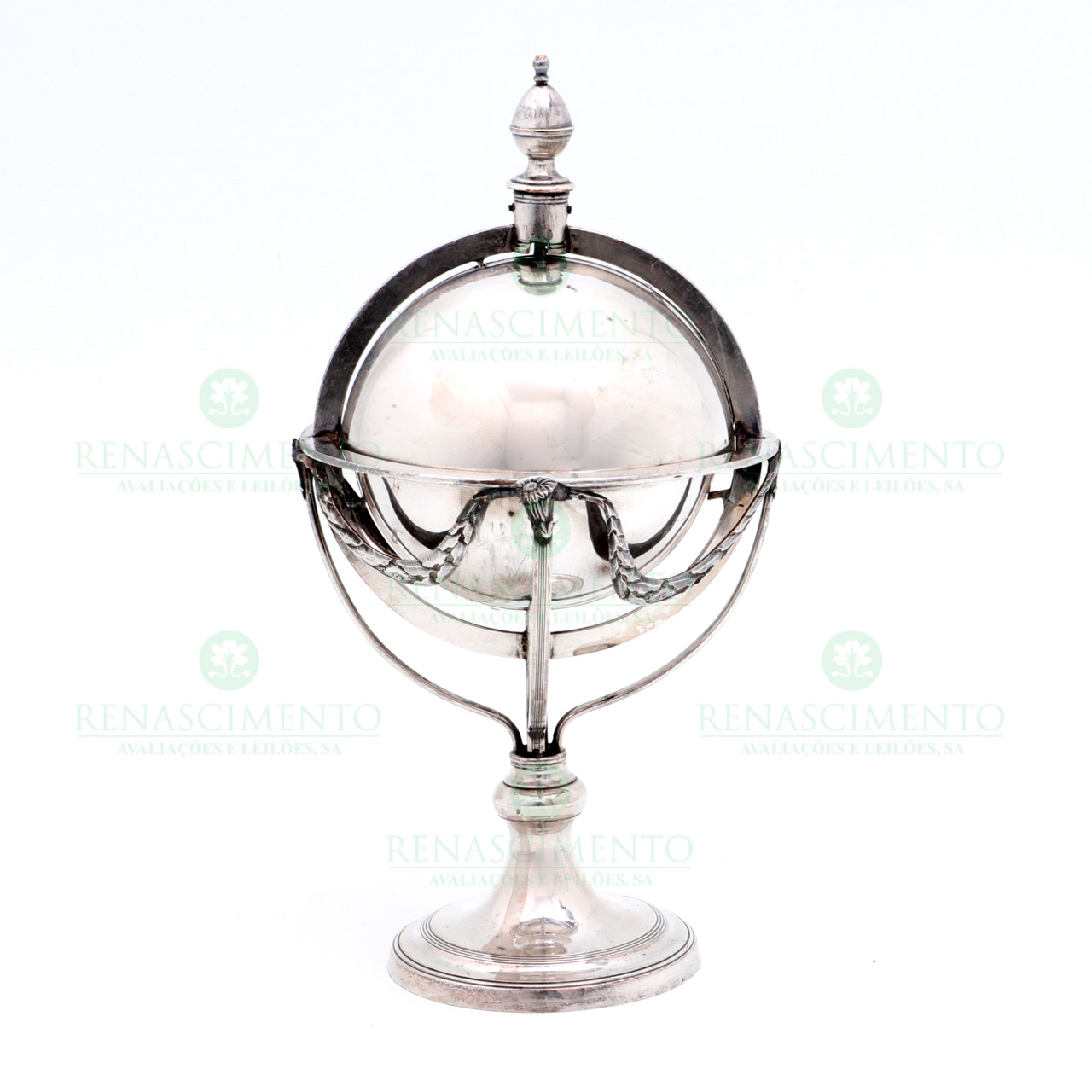 em metal inglês, contendo depósitos, areeiro e tinteiro em vidro azul cobalto facetado. Inglaterra, Séc. XIX. Faltas e defeitos. Alt.: 23 cm.