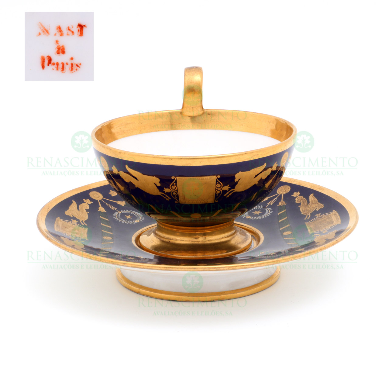 em porcelana de Paris do Séc. XIX, decorados a verde, ouro e prata sobre fundo azul, representando símbolos maçónicos. Peça de colecção. Dim. chávena: 9x12 cm. Diam. pires: 19 cm.