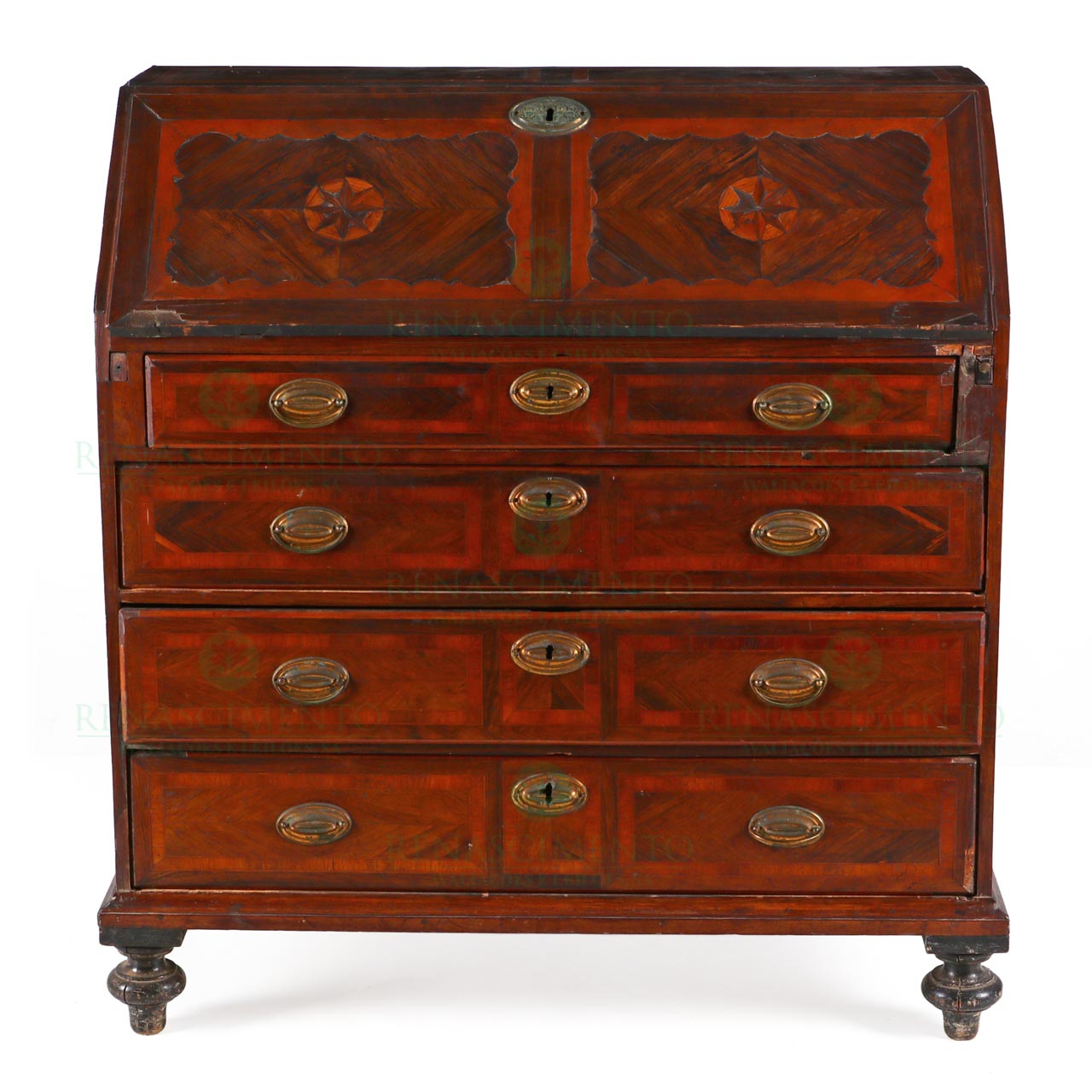 de linhas direitas, marchetada a pau-santo, pau-rosa e espinheiro, tendo na tampa duas estrelas em moldura recortada. Quatro gavetas decrescentes. Interior com quatro gavetas, escaninhos e porta central. Ferragens em latão. Portugal, Séc. XVIII. Faltas edefeitos. Dim.: 113,5x105,5x52 cm.