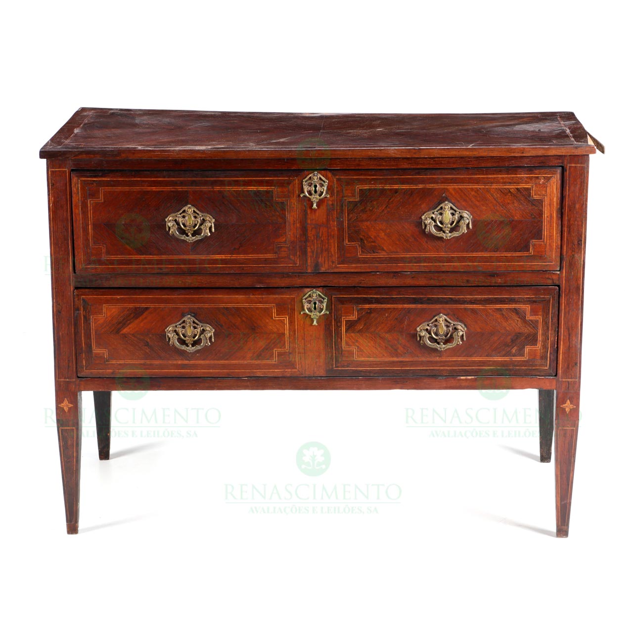 faixeada a pau-santo, com filetes em espinheiro e pau-rosa. Dois gavetões. Ferragens em bronze dourado. Portugal, Séc. XVIII. Faltas e defeitos. Dim.: 84,5x113,5x54 cm.