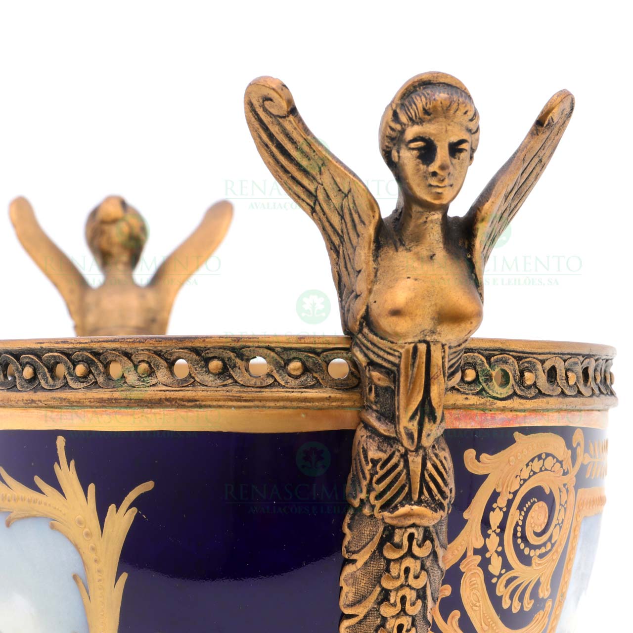 em porcelana ao gosto de Sèvres, decoração com cena de batalha e ouro, com montures em bronze dourado. Dim.: 31x30 cm.