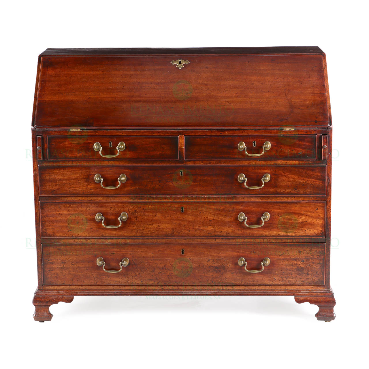 em mogno, com duas gavetas e dois gavetões de tamanho decrescente. Interior com oito gavetas simulando doze e porta central amovível com seis gavetas inclusas. Tampo forrado a pele verde com ferros a ouro. Inglaterra, Séc. XVIII. Dim.: 105,5x121x59 cm.