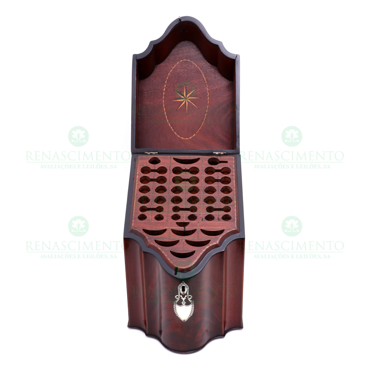 em raiz de mogno, marchetada na tampa, com aplicações em prata sem contraste, ao abrigo do Decreto-Lei n.º 120/2017, de 15 de Setembro - art. 2º, nº 2, alínea c). Interior da tampa igualmente marchetada com estrela. Inglaterra, Séc. XVIII/XIX. Dim.:36x22,5x26 cm.