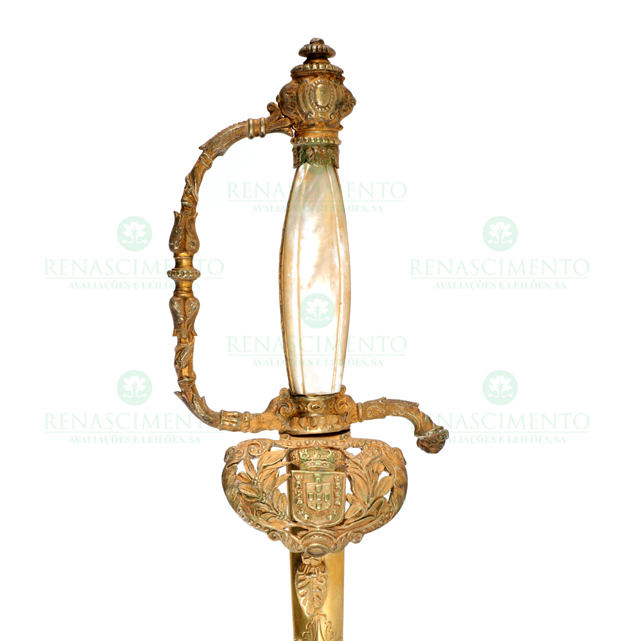 Lâmina recta, triangular vazada, com gravados vegetalistas. Guarda em latão dourado com decoração vegetalista em relevo e Armas Reais Portuguesas. Pomo do mesmo metal. Platinas do punho em madrepérola. Guarnições da bainha em latão dourado. Oxidação,faltas e sinais de uso. Comp. total: 92,5 cm. Comp. lâmina: 77 cm.