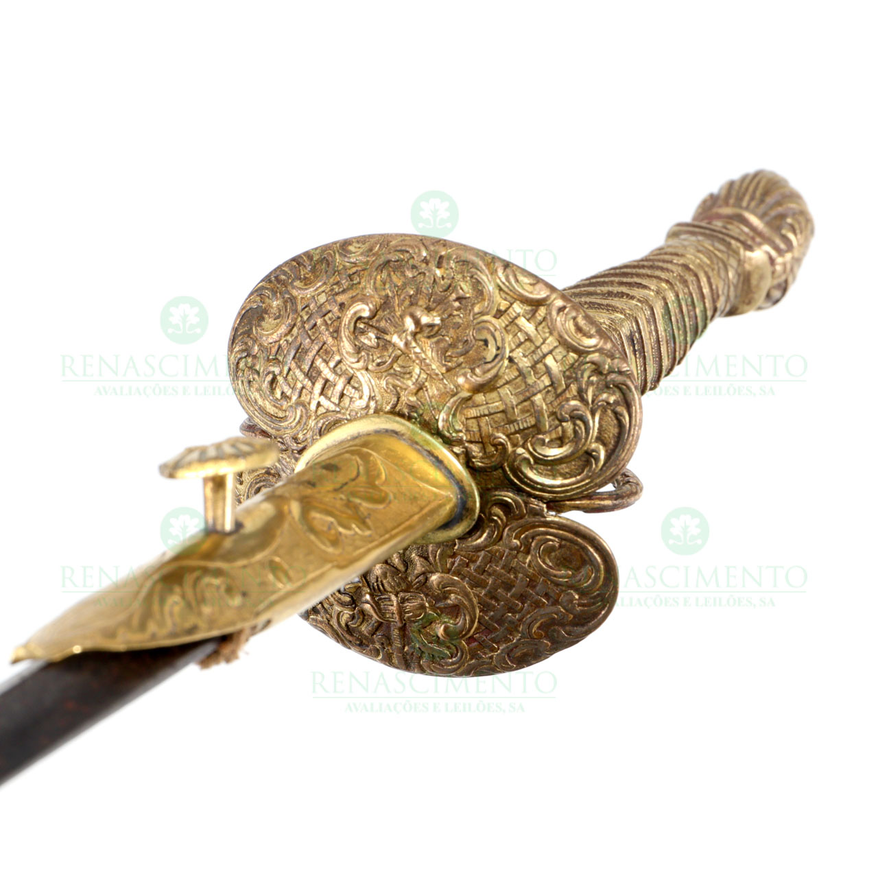 da segunda metade do séc. XVIII. Lâmina recta, triangular vazada, com gravados vegetalistas. Guarda em metal dourado com decoração, em alto-relevo de motivos geométricos e troféus de armas nos copos, punho imitando filigrana, pomo em forma de elmoempenachado. Junta-se bocal da bainha em metal dourado. Oxidação, faltas e sinais de uso. Comp. total: 91 cm. Comp. lâmina: 74 cm.