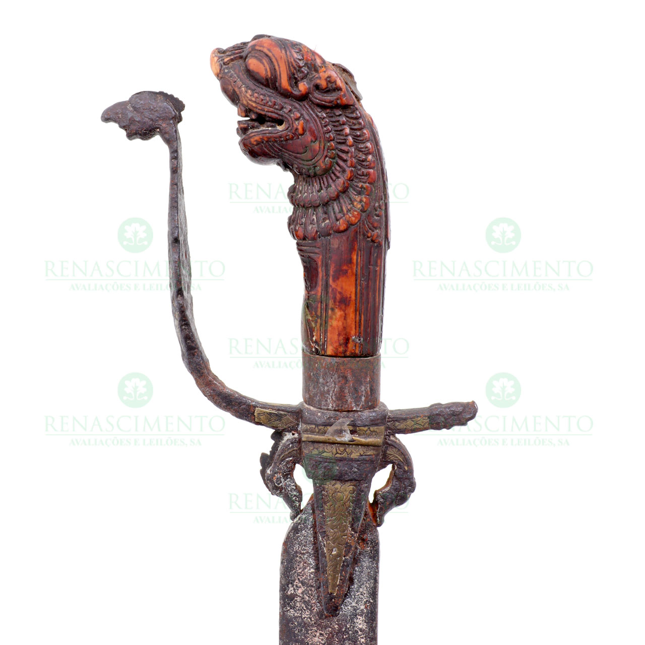 faca com lâmina de um gume e punho em prata sem marcas, ao abrigo do decreto-lei nº 120/2017 de 15 de Setembro de 2017. Sabre com punho em matéria córnea representando cabeça de kilim. Comp. totais: 26 cm e 62,3 cm.