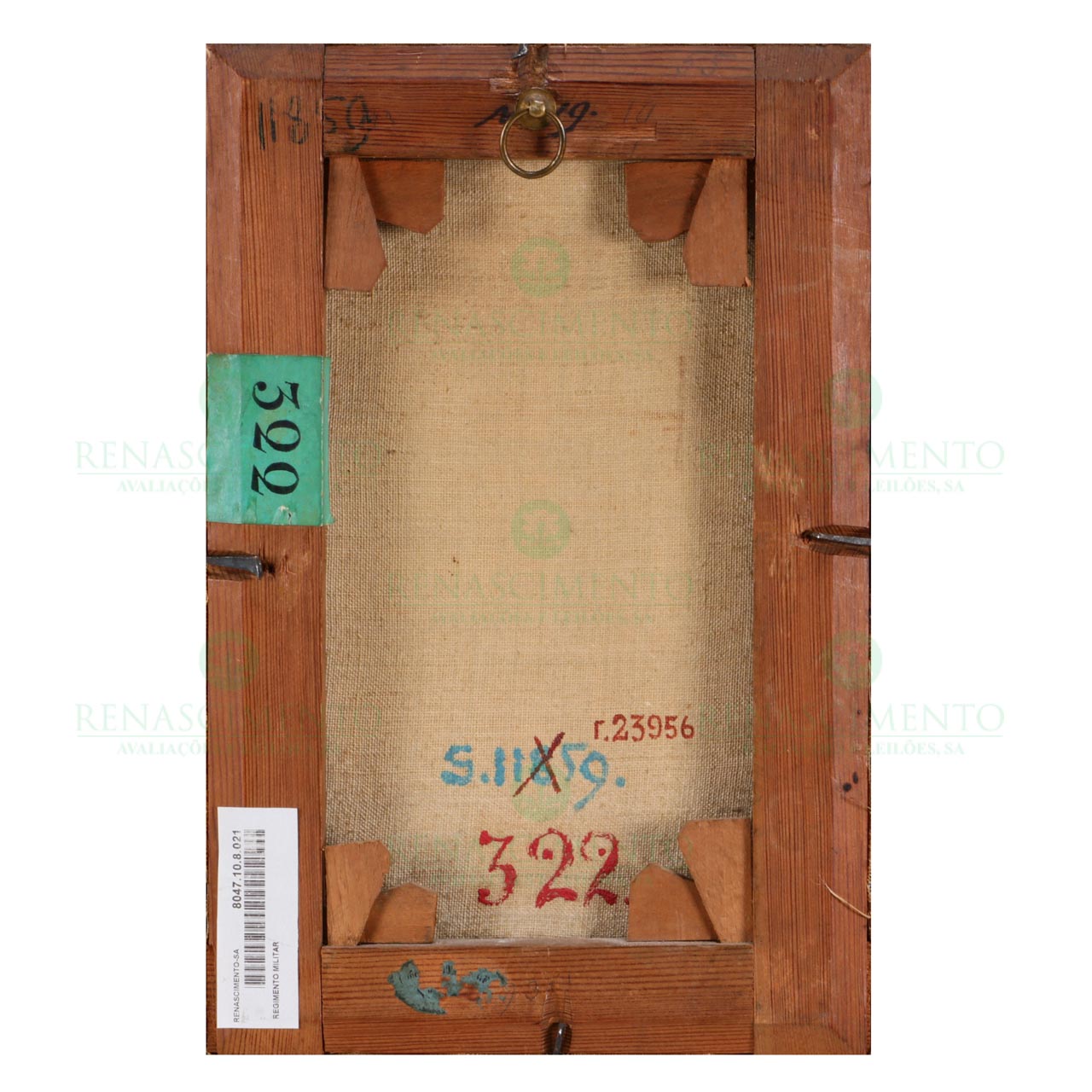 gravura retocada, montada em tela, com inscrições em cirílico antigo. Moldura antiga em madeira e gesso, relevada e dourada a ouro fino. Inscrições antigas no verso e na tela. Pequenas faltas na moldura. Dim.: 28x18,5 cm.