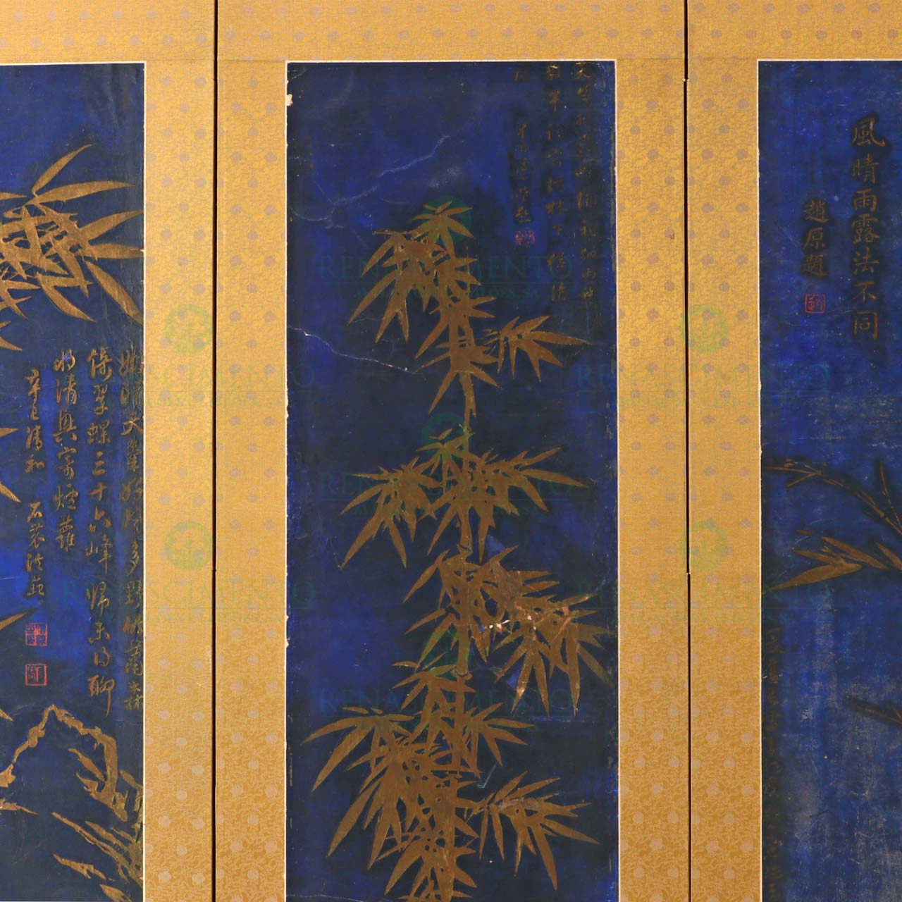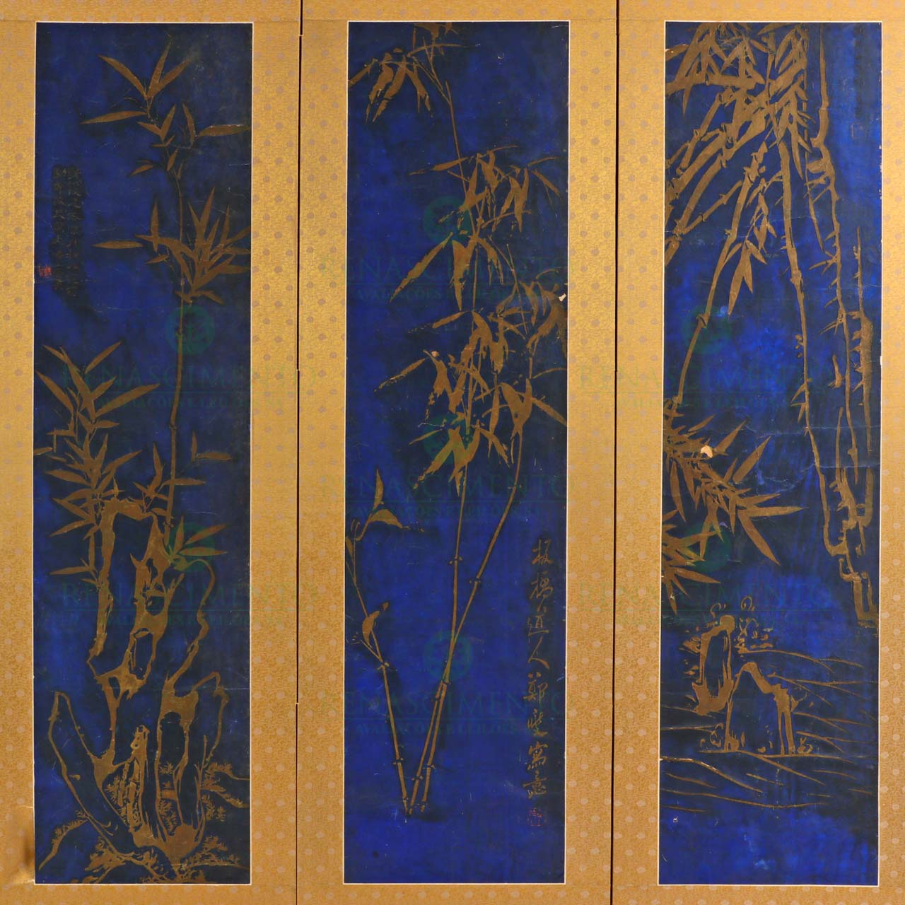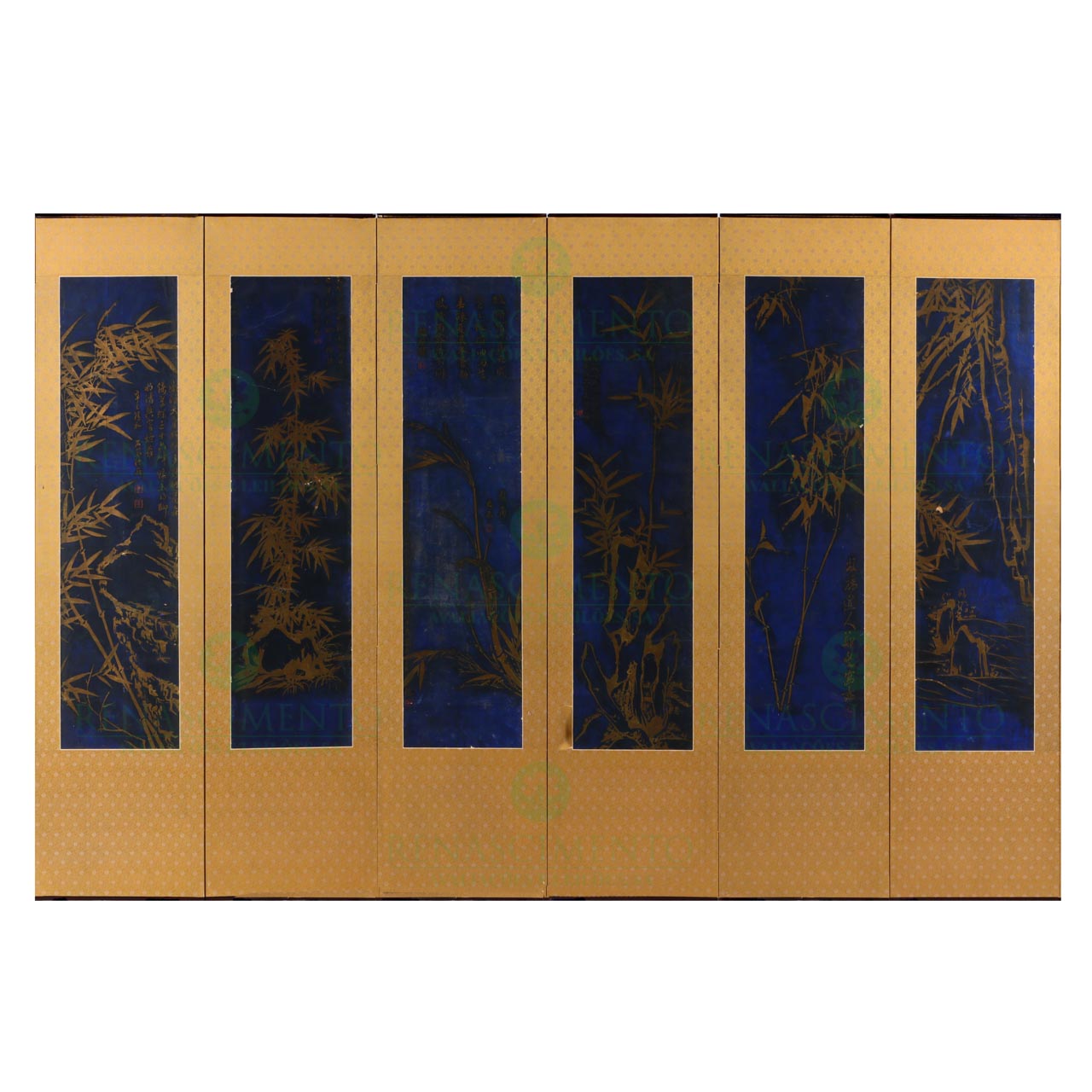 composto por dez folhas, com seda aplicada pintada a guache, representando rochedos com pássaros exóticos, peónias e arvoredo. Reverso com seis painéis em papel pintado a azul e ouro, com bambus. Aplicações em latão gravado. Assinado. Japão, períodoMeiji (1868-1912). Pequenos defeitos. Dim. cada folha: 160x39,5 cm.